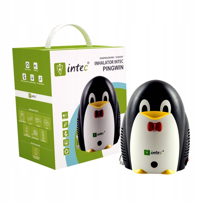Інгалятор Intec Penguin (CN-02 WF2) — професійний медичний прилад, призначений для домашнього використання. Пристроєм з успіхом може користуватися вся родина, а привабливий дизайн неодмінно сподобається найменшим. Велика комплектація інгалятора включає не тільки маску для дітей і дорослих, але і соску, завдяки якій ми можемо робити інгаляції навіть немовлятам. Одним пристроєм може успішно користуватися багато людей, але переконайтеся, що кожен з них має окремий набір аксесуарів (повітряна трубка, небулайзер, наконечник для інгаляції).