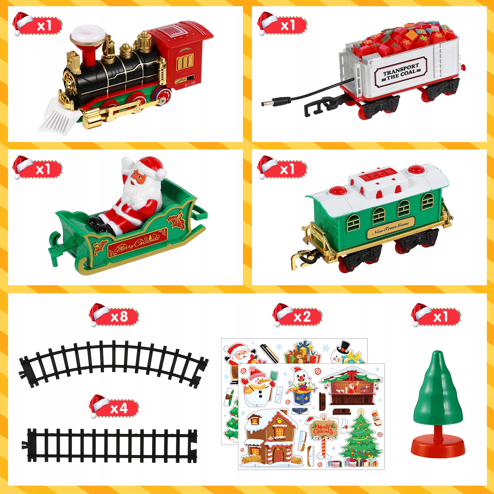 - Набір містить паровоз, легковий автомобіль, вагон із цукерками, сани Діда Мороза, залізничні колії тощо. Усі вони розглядаються з огляду на гру.
