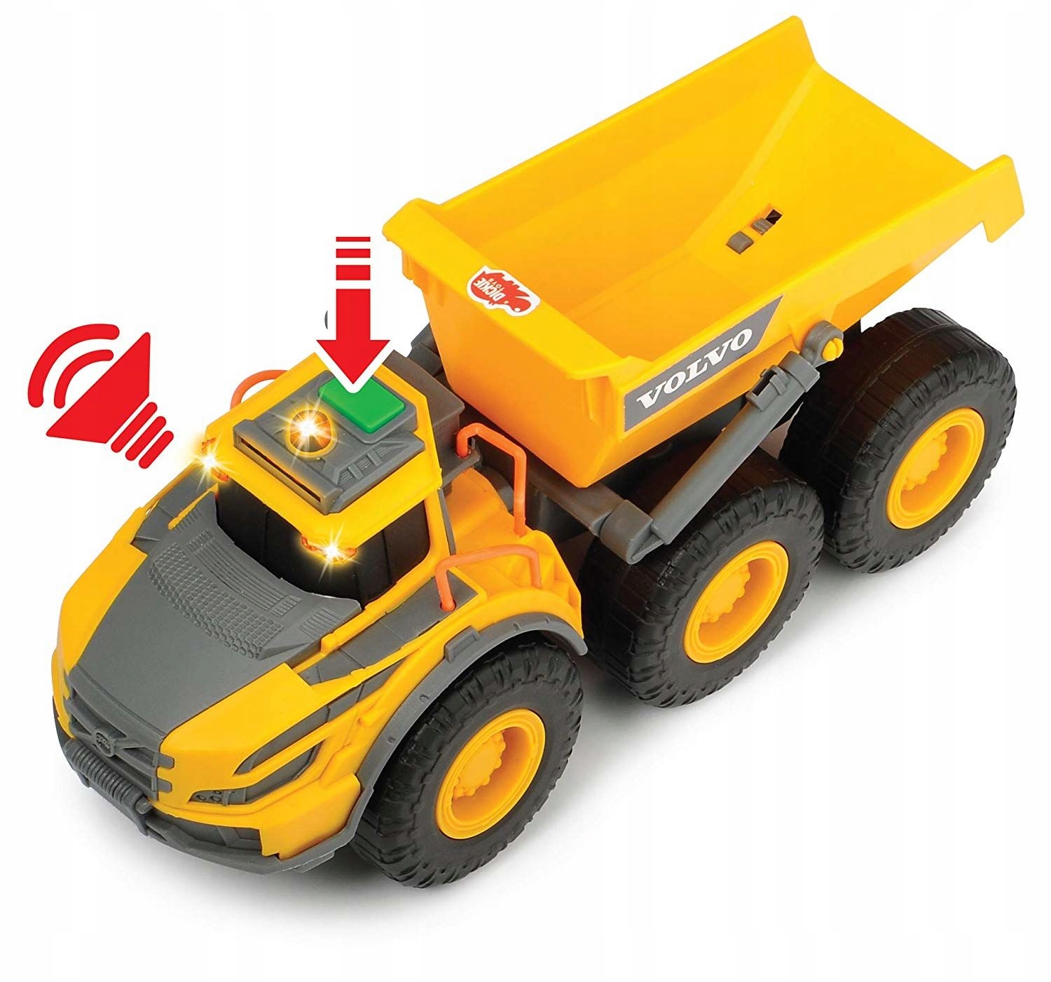 Самоскид жовто-сірого кольору і прикрашений логотип Volvo з боків. Транспортний засіб оснащений рухомим вантажним боксом і чотирма колесами, завдяки яким він може пересуватися по поверхнях. l Машинка ідеально підходить для ігор як у приміщенні, так і на вулиці, де ви можете наповнити коробку піском. У верхній частині автомобіля є кнопка, при натисканні якої вмикаються світлові та звукові сигнали.