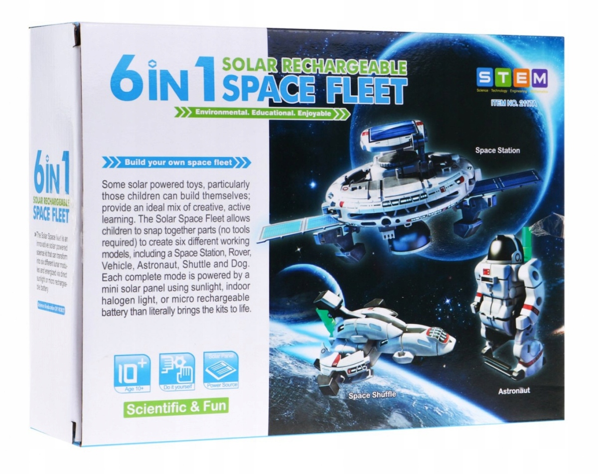- Набір 6-в-1 Solar Space Fleet — це надзвичайно навчальна та захоплююча іграшка, яка дозволяє дітям самостійно зібрати аж шість різних космічних кораблів на сонячних батареях. Завдяки простій системі засувок збірка набору проста і не вимагає використання клею чи інструментів. Крім того, набір дозволяє навчитися використовувати сонячну енергію, що розвиває у дітей екологічну свідомість. У набір входить двигун, сонячна панель, мікробатарея, складальні деталі та графічна інструкція зі складання. Завдяки можливості заряджати транспортні засоби всього за 3 хвилини, діти можуть розважатися навіть у похмурі дні. Іграшка дозволяє будувати такі моделі, як космічна станція, космічний мех, астронавт, дослідницький апарат, космічний автомобіль і космічний човник. Це чудовий спосіб творчо провести час і розвинути ручну майстерність дітей. Розміри коробки приблизно 24 х 18 х 7 см. Відкрийте для себе космічний світ із сонячним космічним флотом 6-в-1!