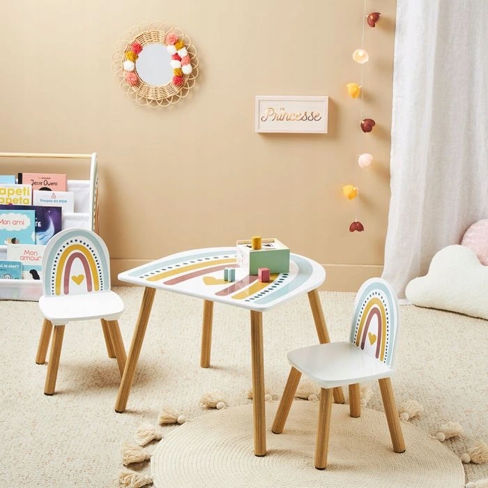 Меблі для дитячої кімнати в сучасних кольорах з веселковим мотивом виготовлені з високоякісної МДФ та сосни. У кожній дитячій кімнаті це створить радісну атмосферу. Практичний набір для дітей є досить тривалим і стабільним, щоб протистояти щоденному використанню. Невеликі розміри ідеально підходять для всіх маленьких дітей. Меблі для дитячої кімнати доставляється в стані розповсюдження, її можна легко зібрати та швидко складати. Наприклад, діти можуть творчо створювати або їсти їжу.