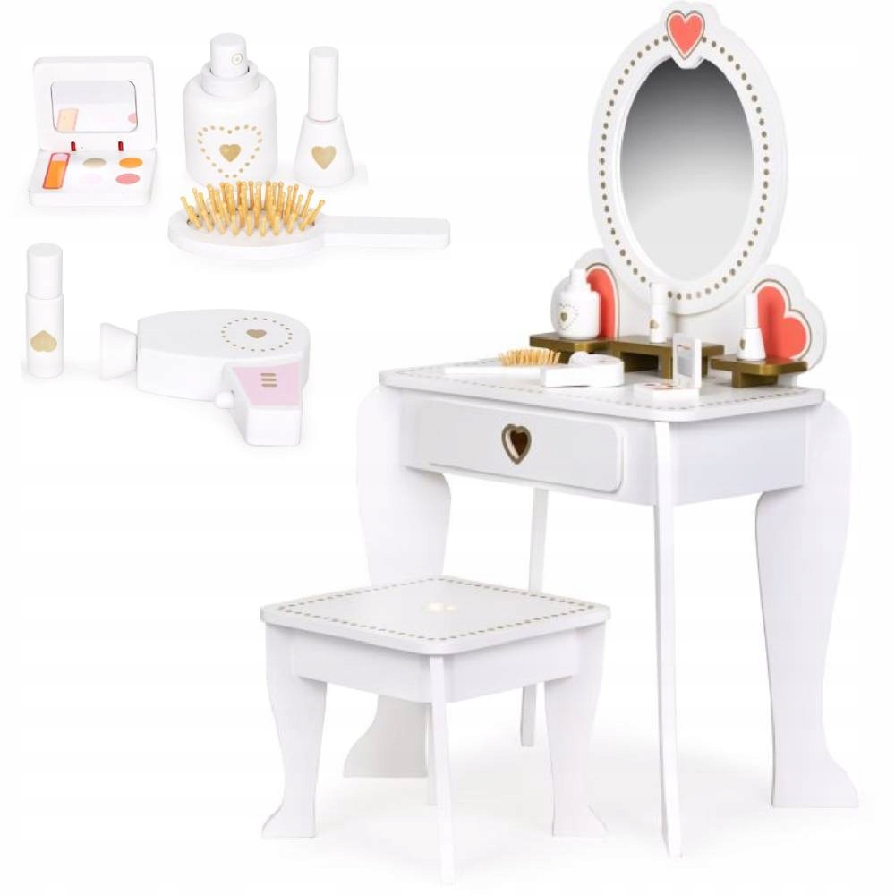 Туалетний столик укомплектований такими аксесуарами, як іграшковий фен, дерев'яна щітка або невелике дзеркало для макіяжу. Усі аксесуари не мають гострих країв. , тому вони абсолютно безпечні для дітей.