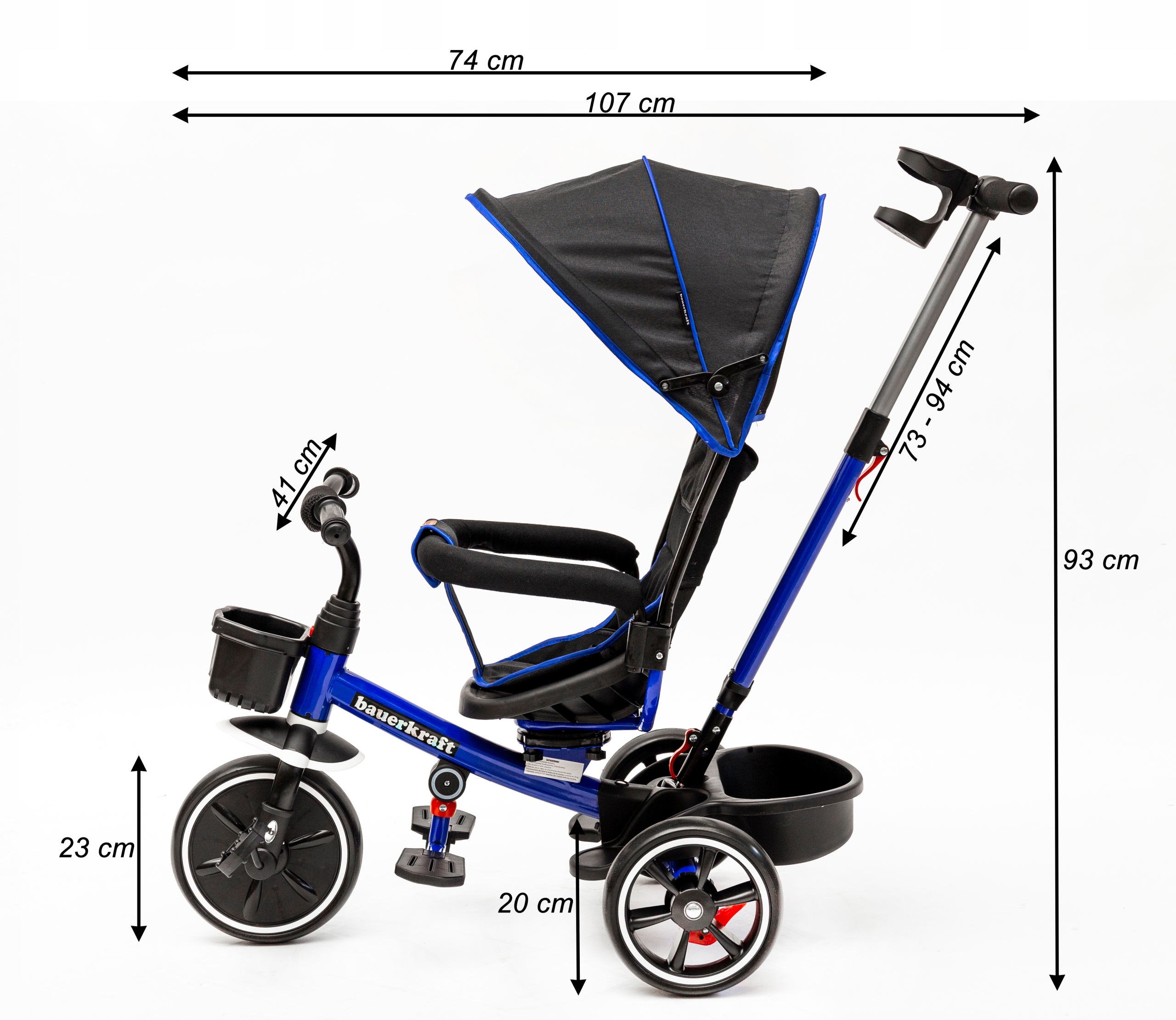 Перший велосипед для кожної дитини -це обіцянка найкращої забави та можливості надзвичайно легкого руху. Комфортне профілеве сидіння, висока стійка спинка, дах, що захищає від надмірного сонячного світла, два захисні бар'єри та особливе місце для базових ніг, безумовно, є його перевагами заради безпеки малюка, використовували путівник, завдяки якому опікун має повний контроль над керуванням автомобілем і спричиняє, що наш велосипед стає обов'язковим першим транспортним засобом кожної дитини. Додатковою привабливістю є передній кошик, завдяки якому молодий водій може взяти всі свої найцінніші скарби у подорож. На задній частині велосипеда є другий контейнер для інших необхідних дрібниць, а на путівнику є місце для пляшки або чашки з напоєм. Ми переконуємось, що під рукою все потрібно