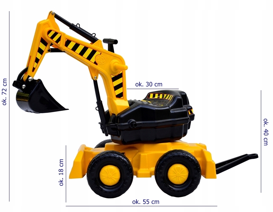 Граючи з екскаватором дитина розвиває координацію рухів, покращує концентрацію та спритність рук. Дитина, що сидить на сидінні, в залежності від напрямку штовхання ніжками, може йти назад або вперед. Протиковзке сидіння іграшки рухливе і обертається навколо власної осі на 360°. Керуючи рухомим важелем і ковшем автомобіля за допомогою спеціальних ручок, ми можемо імітувати роботу справжнього екскаватора.