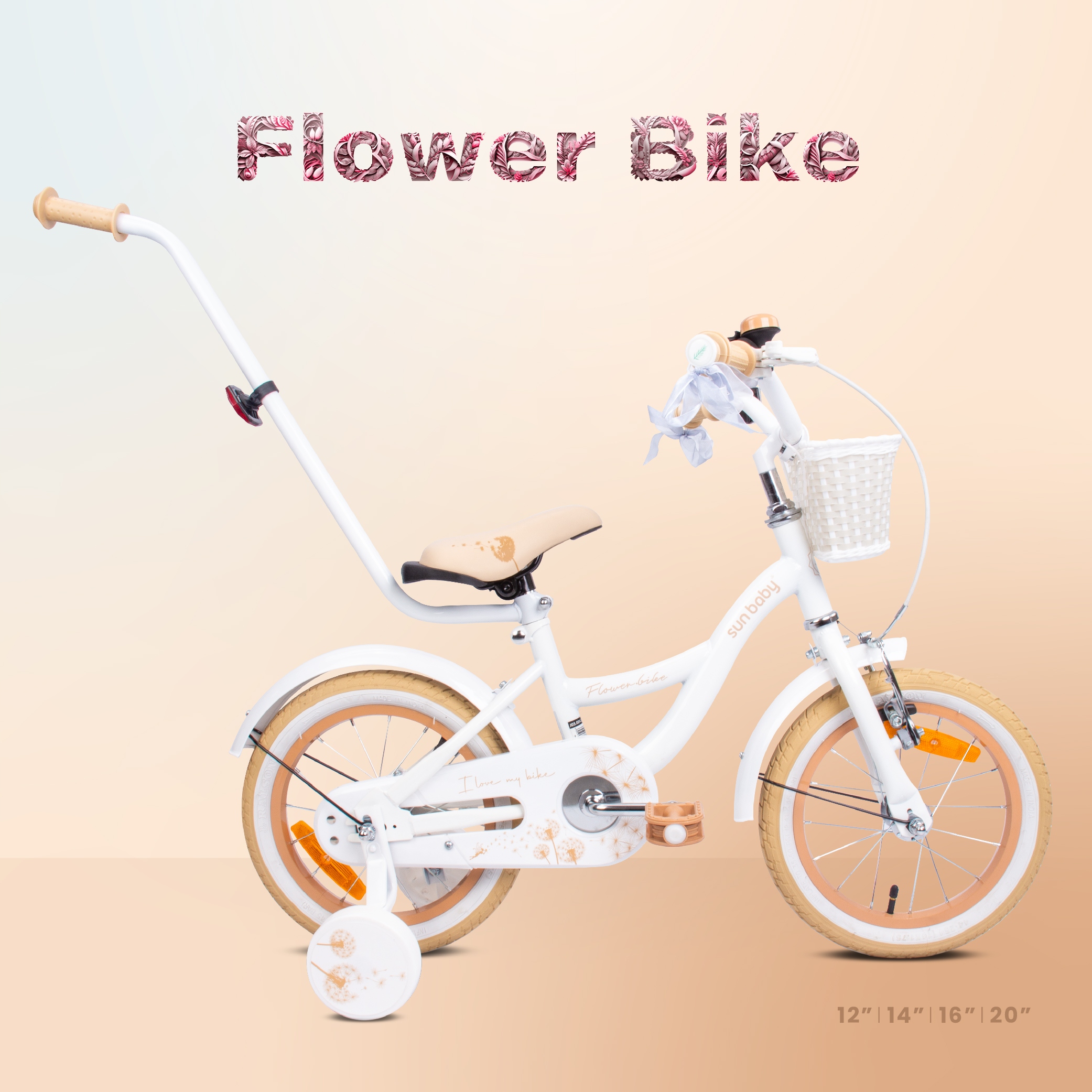 Велосипед для дівчинки 14 дюймів бічні колеса кошики Квітковий велосипед Білий і бежевий сонце дитино ⭐ ⭐ ⭐ ⭐