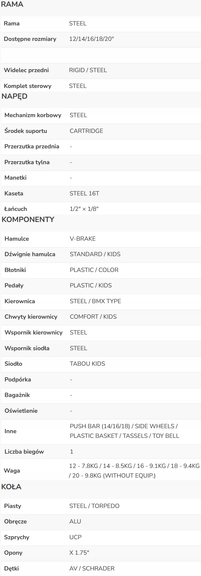 ROCKET — це модель, доступна в розмірах коліс: 12/14/16/18/20", тому ви можете вибрати правильний велосипед для дітей віком від 2 до 8 років.