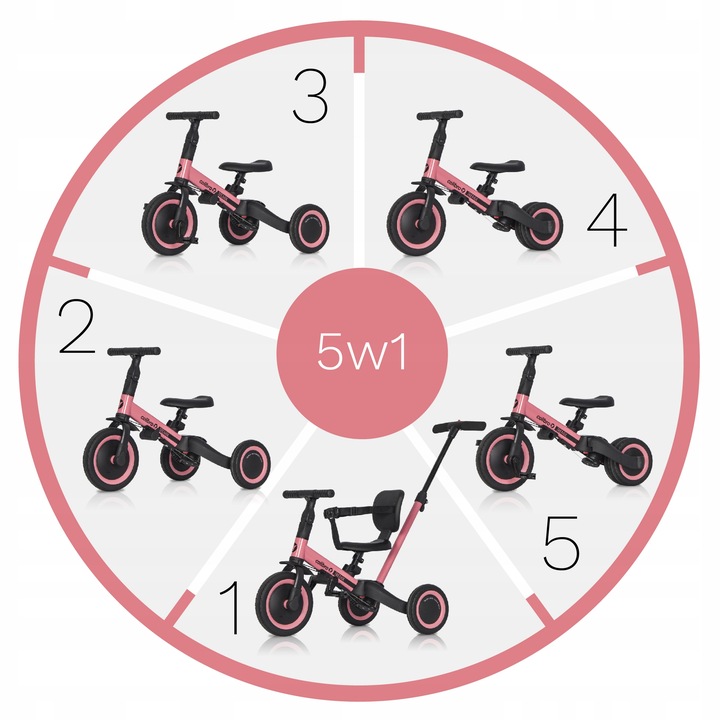 - Версії велосипеда: 6 в 1, коляска (від 1 до 2 років), триколісний велосипед (від 1 до 2 років дитини), триколісний велосипед (від 2 до 3 років), велосипед (від 3 до 4 років), велосипед, двоколісний велосипед з штовхачем (від 4 до 5 років), велосипед двоколісний
