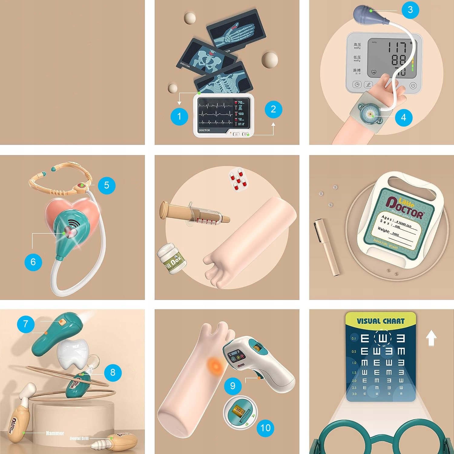 Діти можуть наслідувати лікарів, вдавати, що лікують пацієнтів, і розвивати свої навички у веселій формі. Ідеально підходить для вечірок, удаваних ігор, рольових ігор, шкільних уроків, а також як подарунок на Різдво чи день народження.