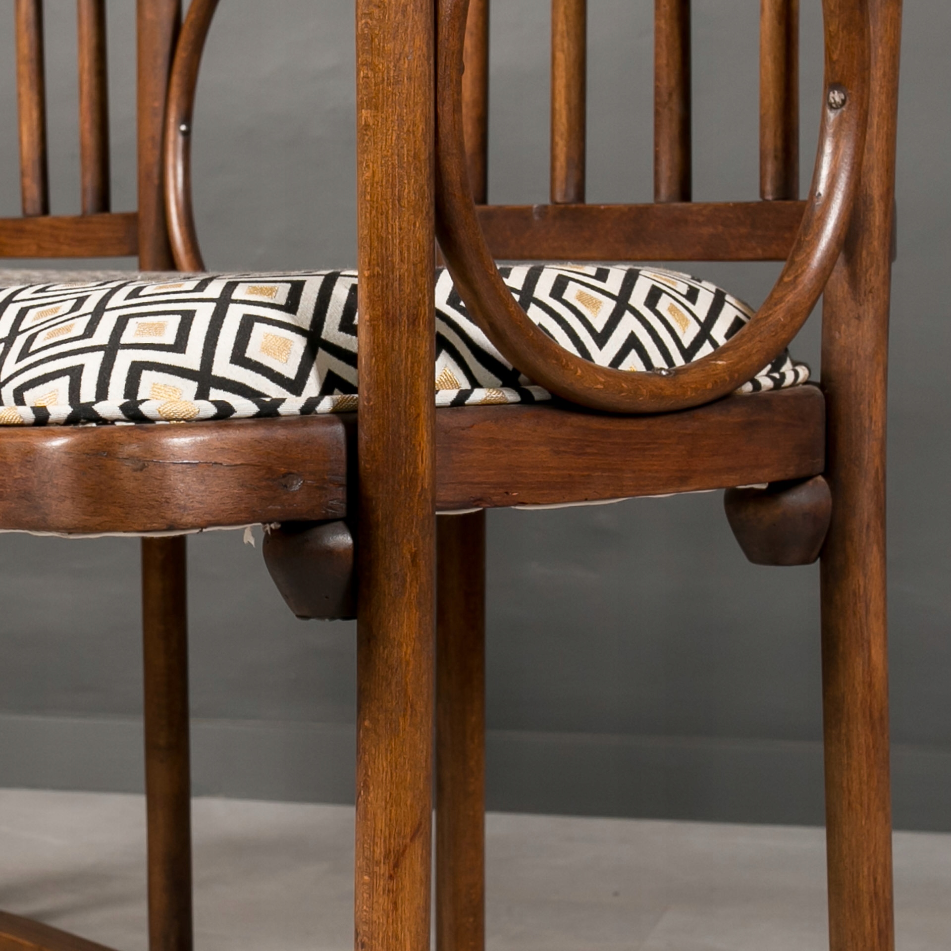 Ця унікальна лава з гнутого дерева була створена на початку 20 століття і приписується Йозефу Гофману, розроблена для Thonet - Mundus. Ця модель з'явилася в каталозі в 1907 році і тоді її порівнювали з більш популярною моделлю J. & J. Kohn, однак деякі відмінності можна побачити в деталях, наприклад, круглий елемент під підлокітниками замість ромба. Конструкція виготовлена з гнутої деревини бука, яка була делікатно очищена та оновлена високоякісним маслом і воском, що не тільки захищає деревину, але й надає їй гарного природного вигляду. Сидіння було оббито красивою чорно-білою тканиною з геометричним малюнком і золотими вставками. Представлений у чудовому відреставрованому стані, цей диван стійкий і повністю підготовлений для щоденного використання, забезпечуючи не тільки тривалу функціональність, але й неперевершену витонченість. Зробіть свій внутрішній простір привабливішим за допомогою цього унікального виробу, який обов’язково приверне увагу та додасть вашому інтер’єру відчуття позачасового шарму.