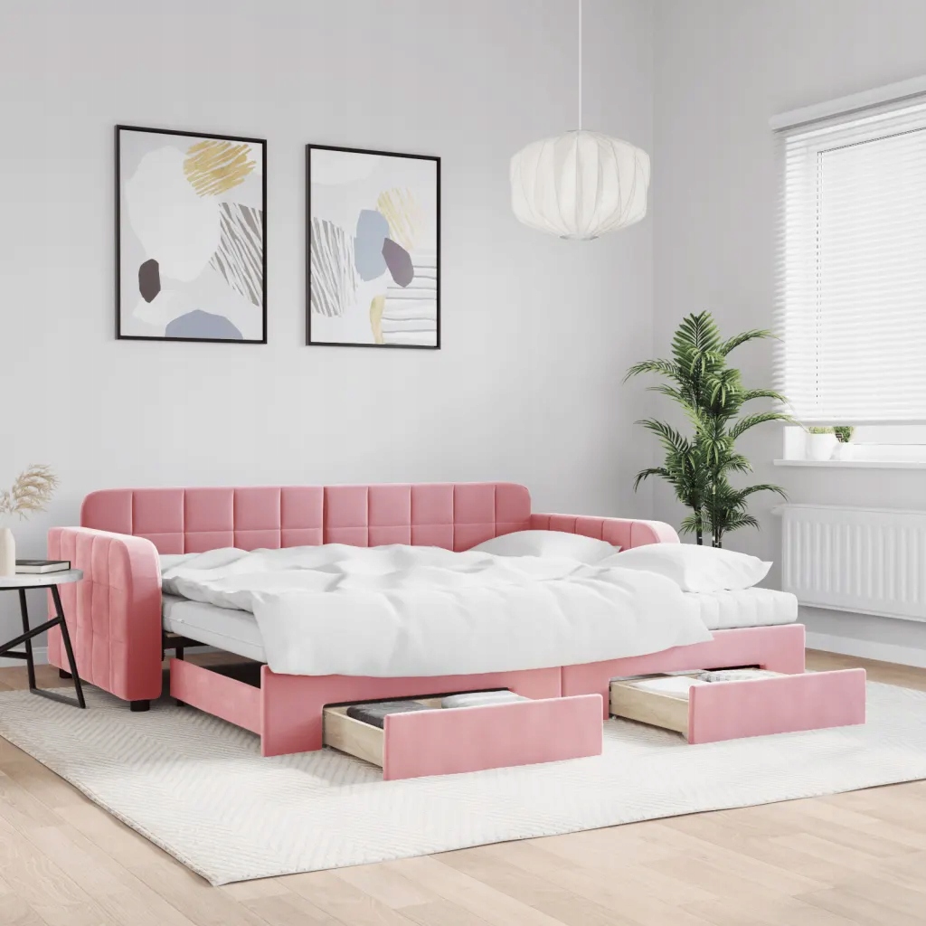 Диван-ліжко 2-в-1 з рожевого оксамиту з висувними ящиками на коліщатках