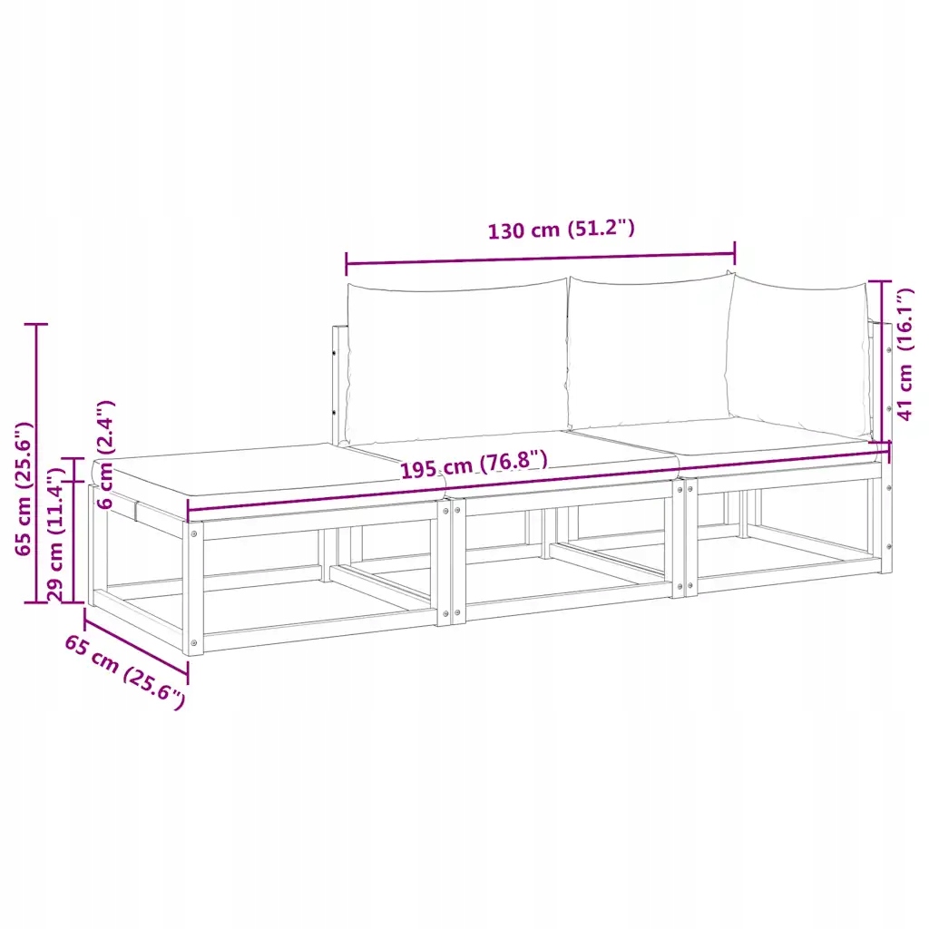 - Подушки: Наповнювач з поролону та поліефірного волокна, розміри: 65 x 65 x 6 см (сидіння), 65 x 41 x 15 см (спинка).