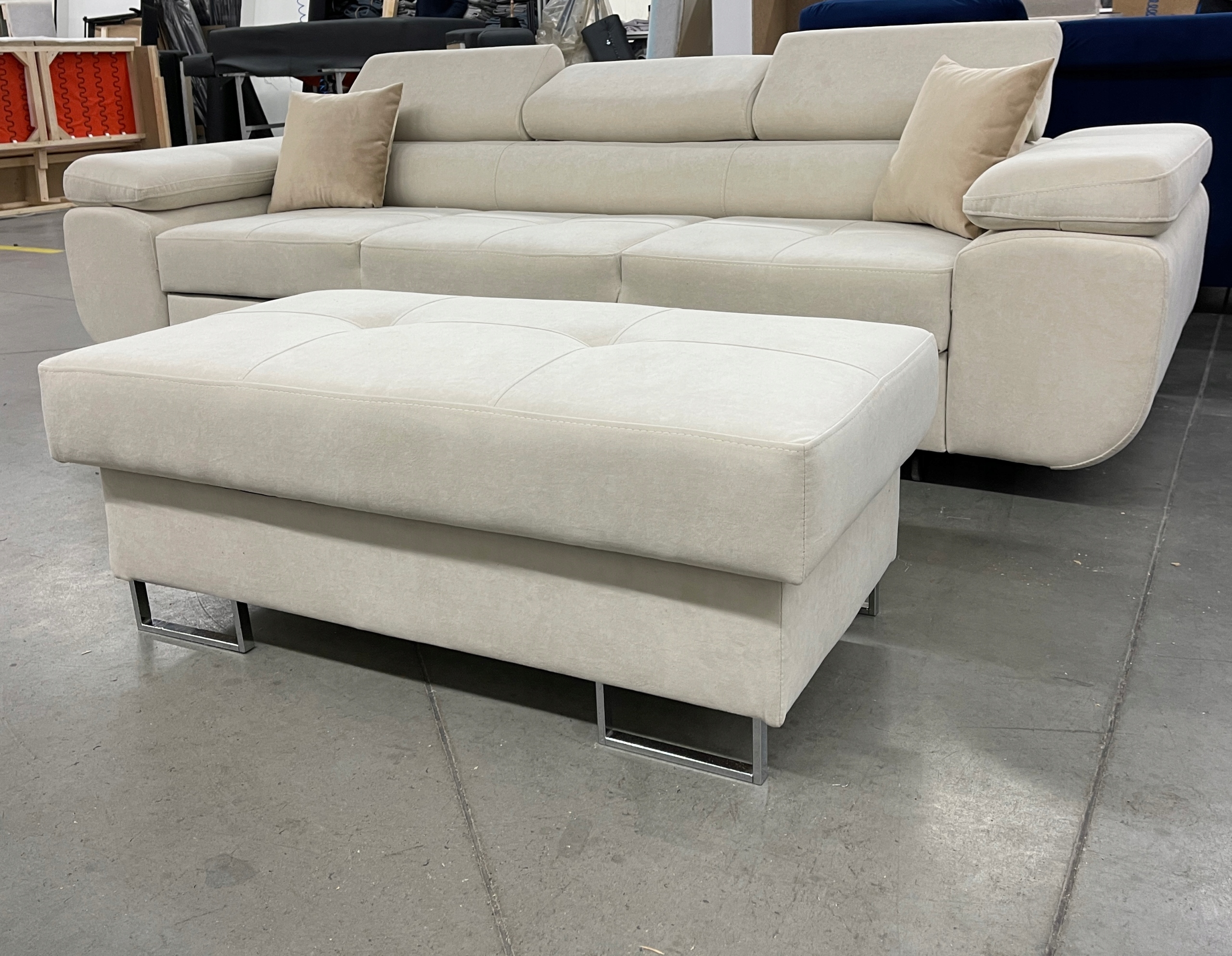 Сучасний лаунж-комплект, що складається з функціонального дивана з функцією сну, зручного крісла та пуфа, що відкривається. 4-ступеневе регулювання підголівника. Завжди корисна функція для сну та контейнер для постільної білизни. Зроблено з надзвичайною увагою до деталей. Дизайн, який привертає увагу з першого погляду. Комфорт у використанні завдяки технології хвилястих пружин і високогнучкому пінопласту. Міцна рама являє собою комбінацію дерева та ДСП.
