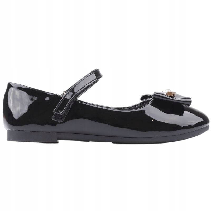 Балетки для дівчинки на плоскій підошві, ремінець, що підтримує стопу, застібається на липучку, спереду декоративний бантик з цирконами. Виготовлений з лакованої екологічної шкіри. Вони ідеально виглядатимуть для великих свят.