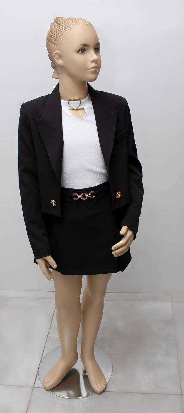 Чорний колір надає куртці дівочого, елегантного та універсального персонажа. Це класичний відтінок, який ідеально працює в більш офіційних стилізаціях. Довгий рукав робить куртку придатною для більш прохолодних днів, додавши дівочу стильність елегантності та тепла. Золоті ґудзики додають дівочого персонажа до піджака. Комір додає витонченість до піджака і підкреслює шию. Він може мати різні форми, від класичного коміра до більш декоративних варіантів. Така чорна куртка з декоративними кнопками та комір буде ідеально підходить для більш офіційних результатів або особливих випадків, додаючи дівочу гардеробну елегантність та стиль. Це також чудовий варіант носити сукні, спідниці або штани, створюючи всебічний та модний стиль.