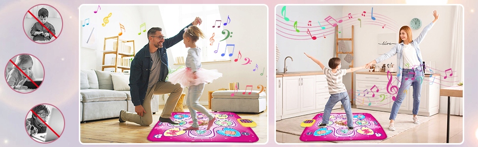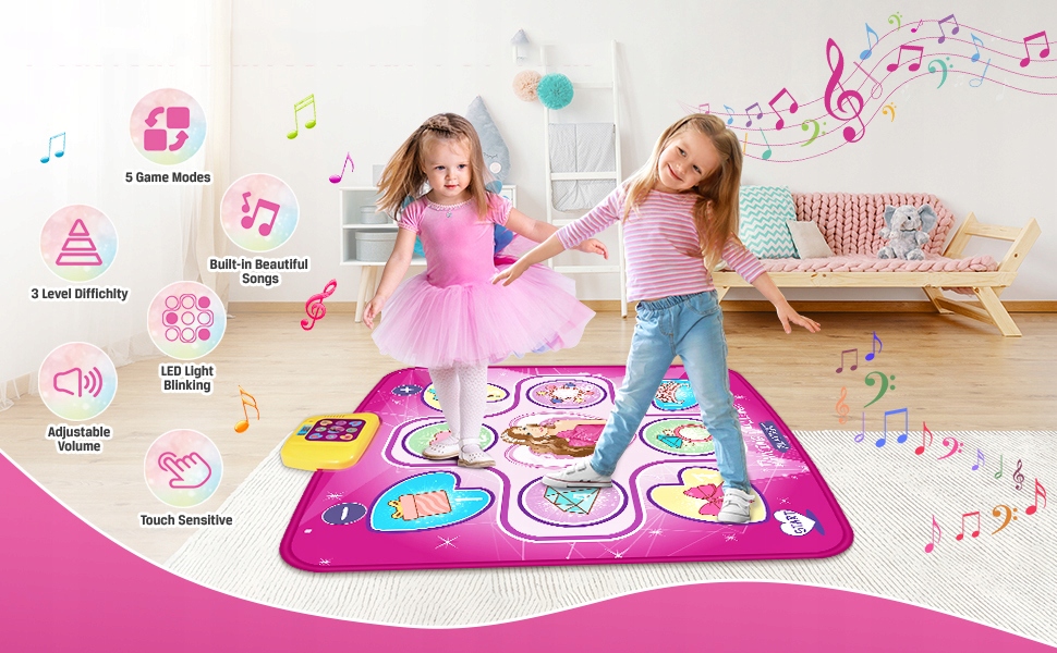 ctive та реактивних: , виготовлених з м'яких та високоякісних неволених матеріалів, музична іграшка для дівчат безпечна та нетоксична. На танцювальному килимку є 8 нот, він дуже чутливий і автоматично розпізнає, коли дитина торкається його або наступає на нього. Танцювальний килимок міцний, його можна використовувати багато разів і його легко витерти, заощаджуючи час батьків після гри у дітей