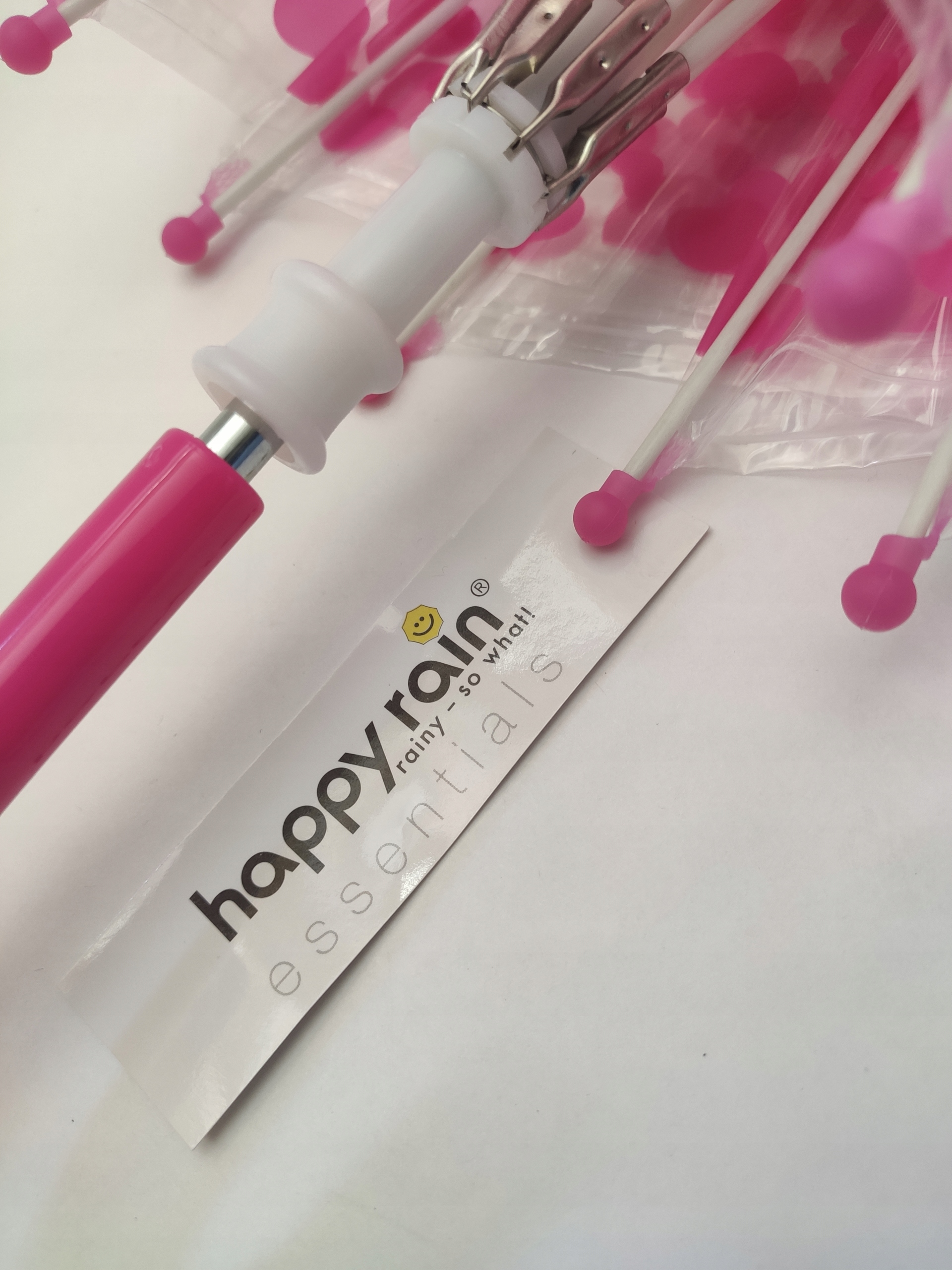 Легка конструкція з 8 натяжних дротів і скловолокна, покрита товстою прозорою плівкою, стрижень парасольки довжиною 57 см. має гнуту рожеву ручку.