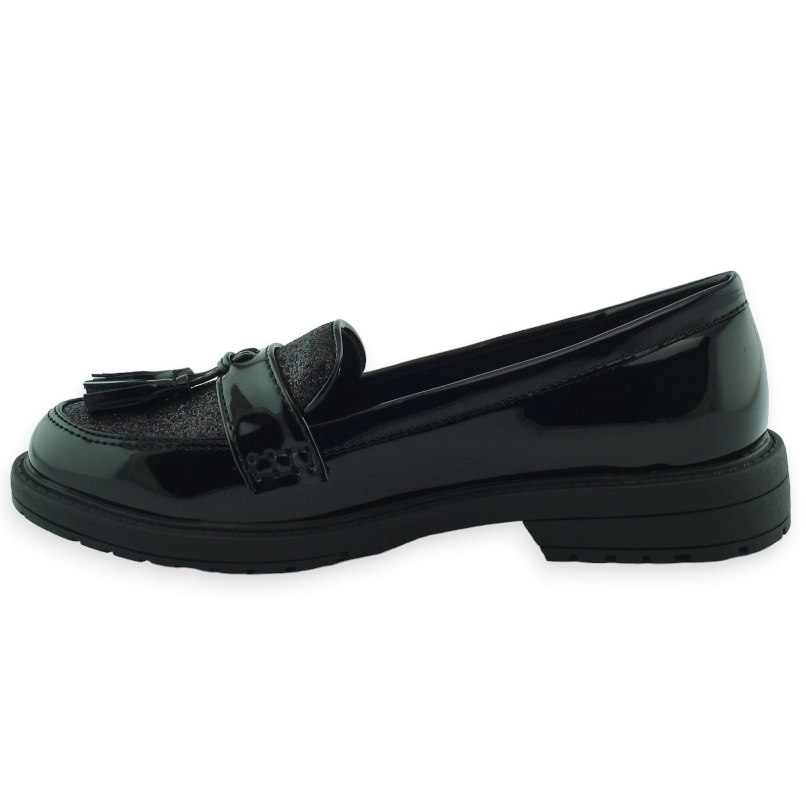 Елегантні чорні мокасини для дівчаток на зручній, стійкій підошві. Дуже стильний дизайн підійде під будь-який стиль, як елегантний, так і повсякденний. Ідеальні мокасини для школи або прогулянки.