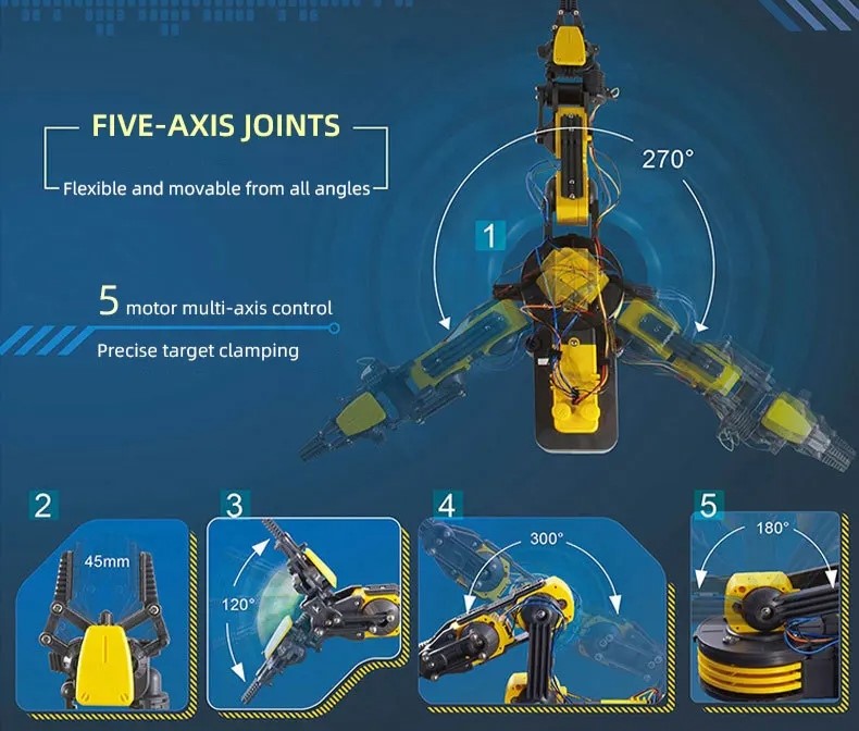Відкрийте для себе захоплюючий світ робототехніки з нашим сучасним багатофункціональним набором роботів! Ідеально підходить для молодих людей, які цікавляться наукою, інженерією та технологіями, цей набір не тільки розважає, але й навчає. Створений, щоб надихнути на творчість і розв’язувати проблеми, наш набір дозволяє дітям створювати власні механічні руки та керувати ними, пропонуючи нескінченні години інтерактивної гри.