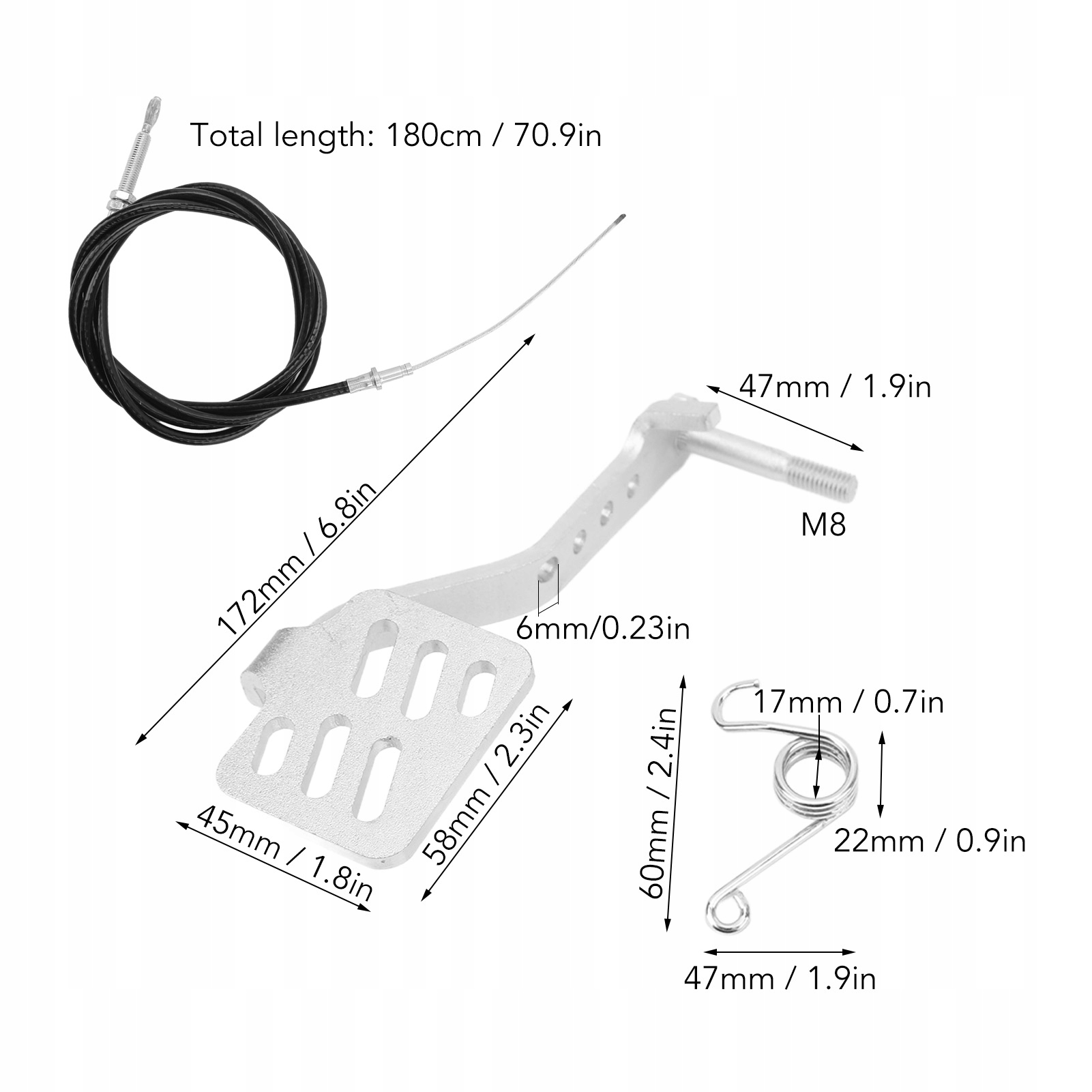 5. Пакет включає: ви отримаєте 5-частинний набір, що містить педаль гальма, педаль дросельної заслінки, кабель дросельної заслінки, пружину повернення педалі гальма та зворотна пружина дроселя.