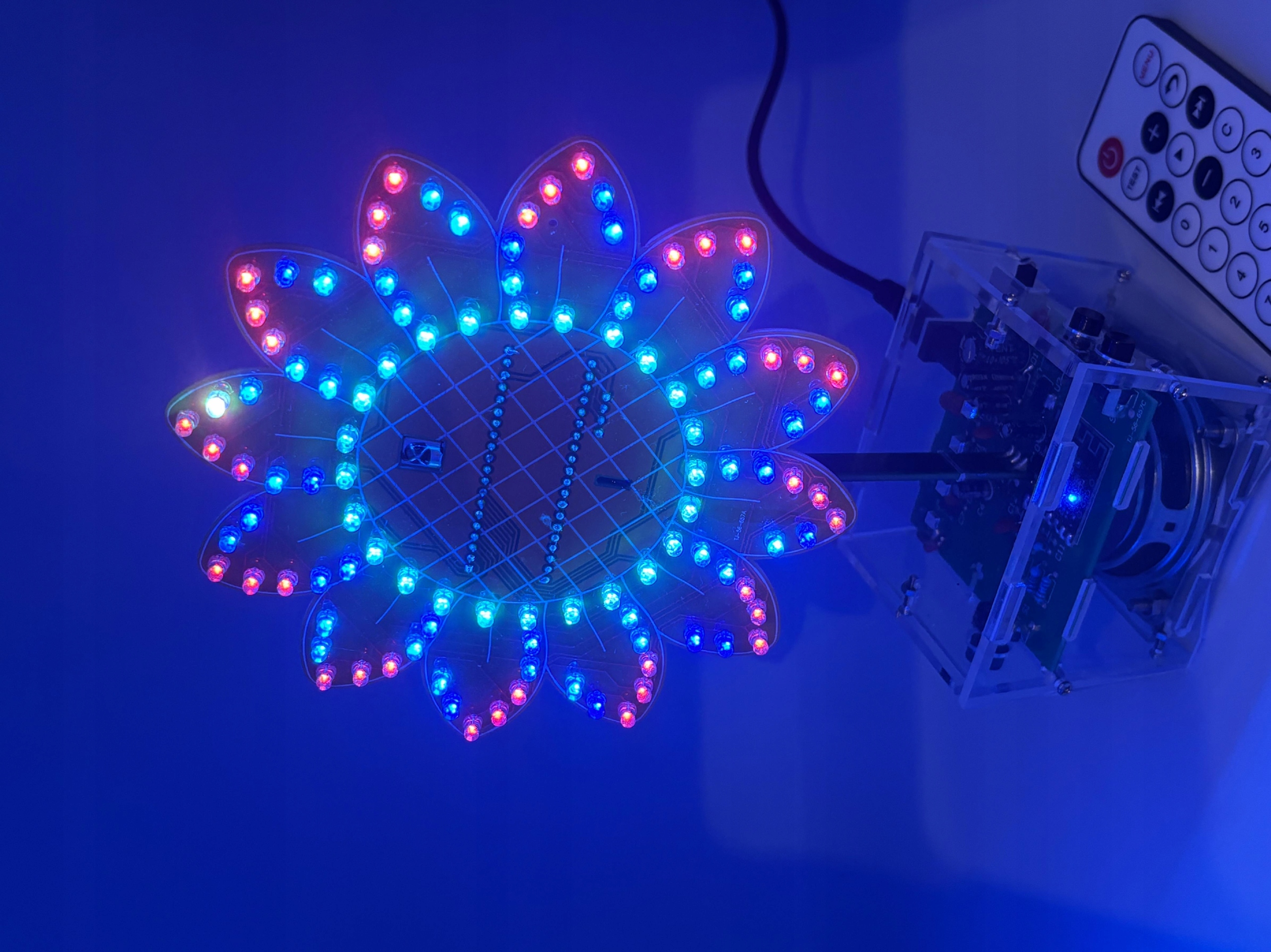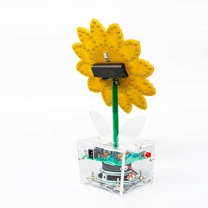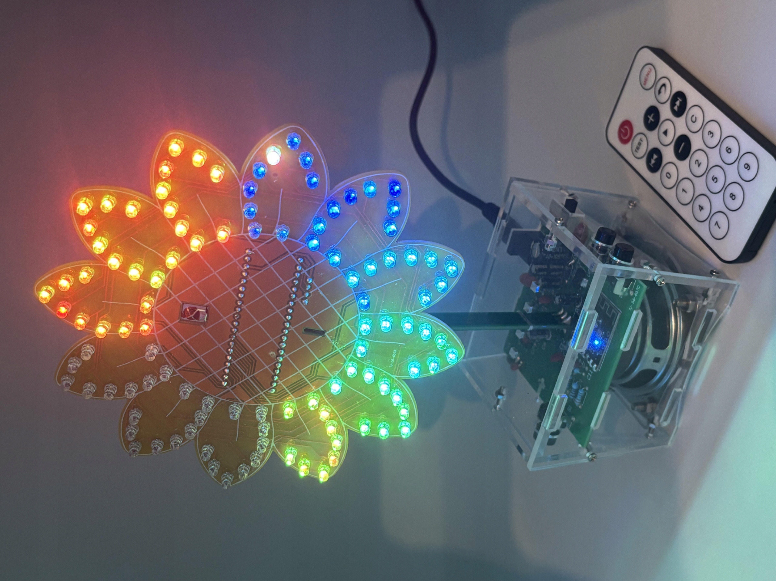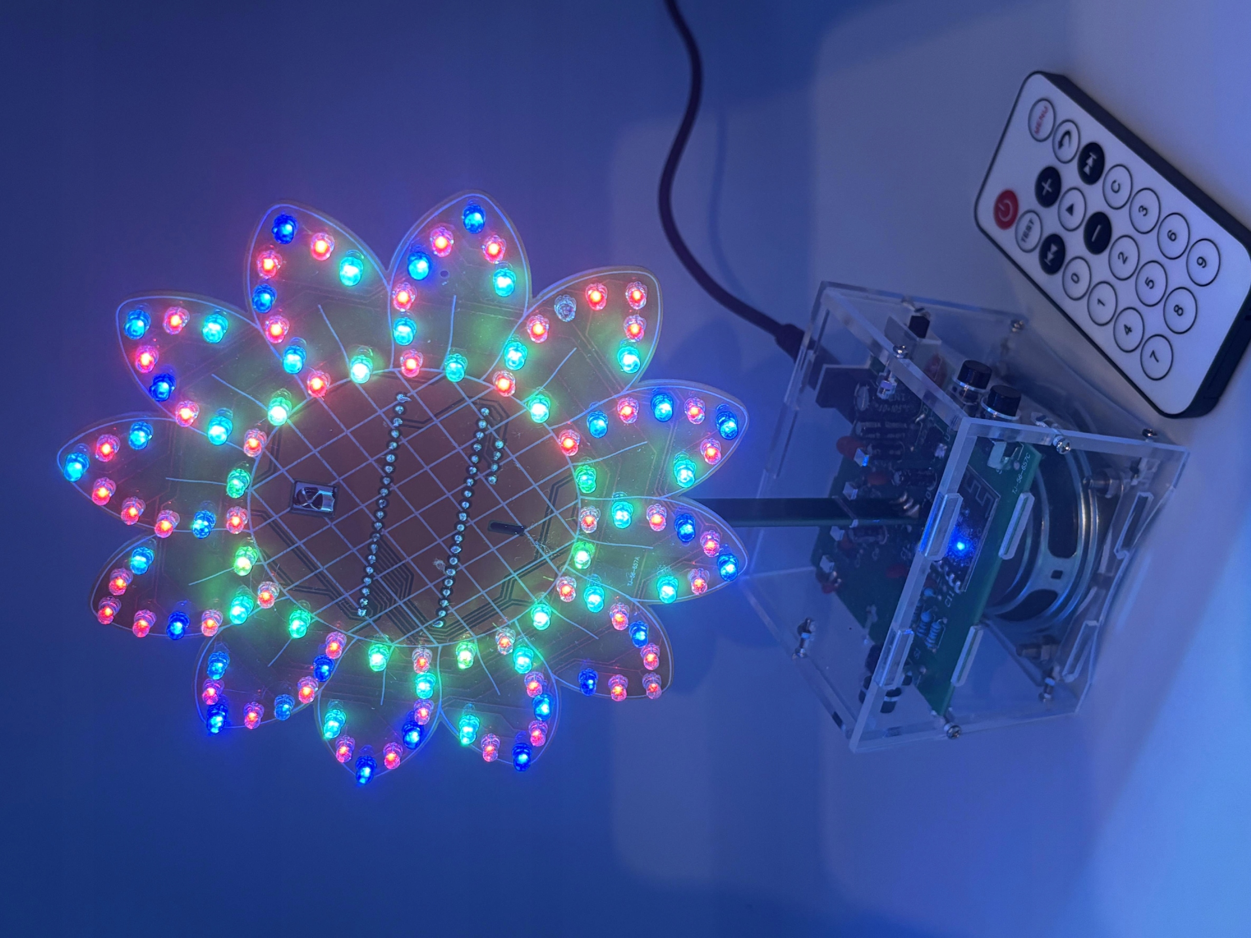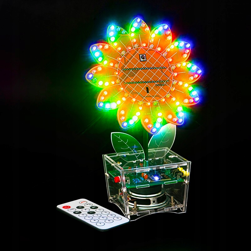 Технічні характеристики: Основні компонентиSTC15F2K60S2 MCU, підсилювач HT6872, регулятор ASM1117-3.3V Вимоги до живленняМінімум 5 В/1 А (роз’єм USB-C або 5,5 мм постійного струму) АудіовихідМонодинамік 2 Вт з регулятором гучності Методи керуванняІнфрачервоний пульт (20 функцій) + 3 фізичні кнопки Світлодіодна матриця110 світлодіодів RGB у формі соняшника