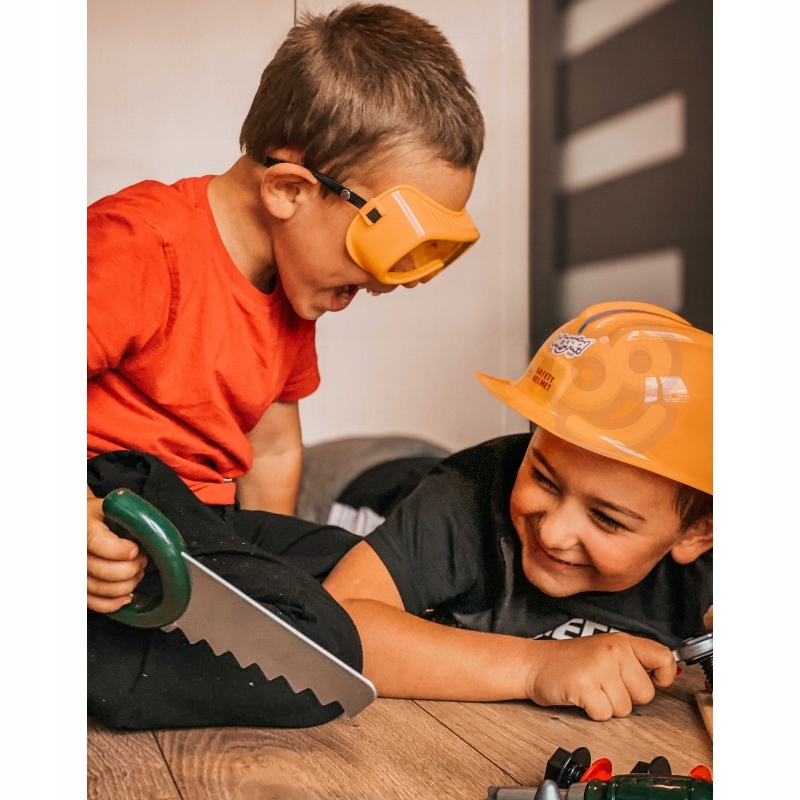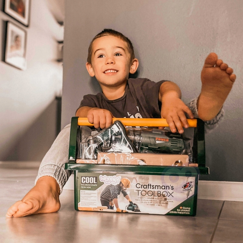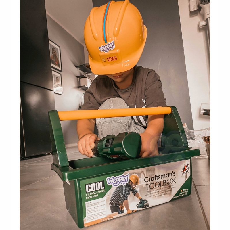 - Ящик для інструментів із викруткою та дрилем створений компанією WOOPIE, улюблений дітьми. У набір входить темно-зелений місткий ящик для інструментів зі зручною жовтою ручкою і 15 елементів. Серед інструментів діти знайдуть акумуляторний шуруповерт і дриль із 3 змінними наконечниками. Шуруповерт/дриль імітує справжній пристрій завдяки своїм звукам і обертовому гвинту. Крім того, в набір входить пилка зі зручною ручкою, молоток, гайковий ключ, дві пластикові дошки з отворами для загвинчування шурупів (4 в наборі) або забивання цвяхів (2 в наборі). Цей набір подарує велике задоволення кожному маленькому любителю саморобки, одночасно сприяючи розвитку ручних навичок.