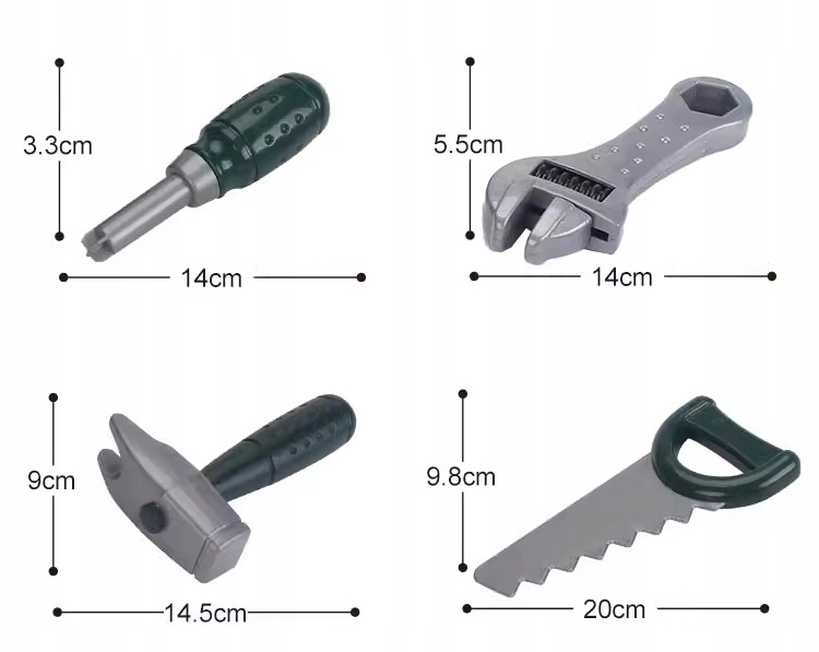Набір містить різноманітні інструменти, такі як викрутки, молоток, гайкові ключі, пила, шолом, захисні окуляри та багато іншого. Кожен інструмент був ретельно розроблений, що забезпечує довговічність і безпеку під час використання.