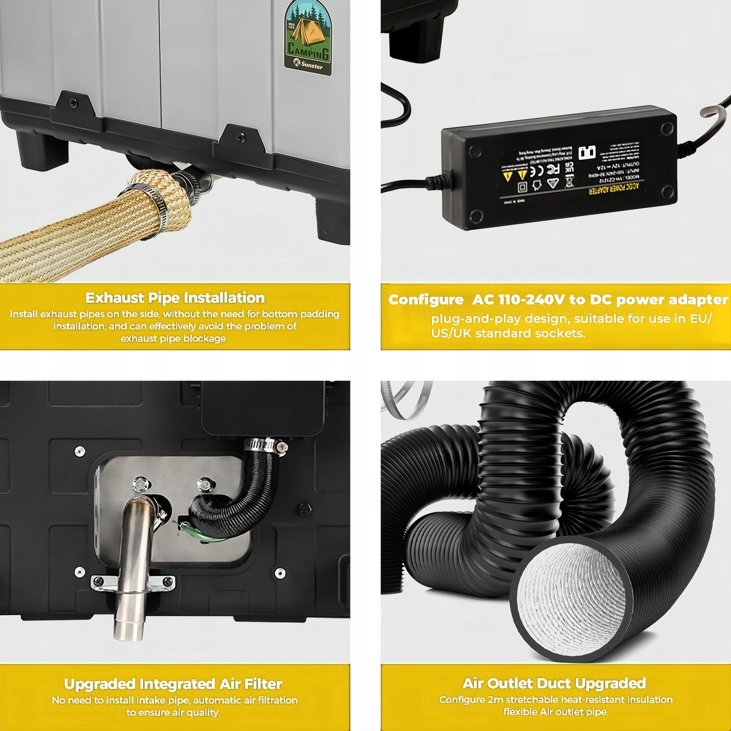 Оснащений 2 варіантами підключення: адаптер 110-240 В і зовнішній Т-подібний штекер 12 В постійного струму, конструкція «вмикай і працюй» дозволяє гнучко перемикати проводку залежно від місця розташування/транспортного засобу, підходить для використання в стандартних розетках ЄС/Великобританії/ЄС, автомобільних акумуляторах DV12/24 В, відкритих акумуляторних батареях, що забезпечує комфортне опалення в різних місцях, таких як автомобілі, кемпери, вантажівки, трактори, гаражі, котеджі, відкритий кемпінг тощо