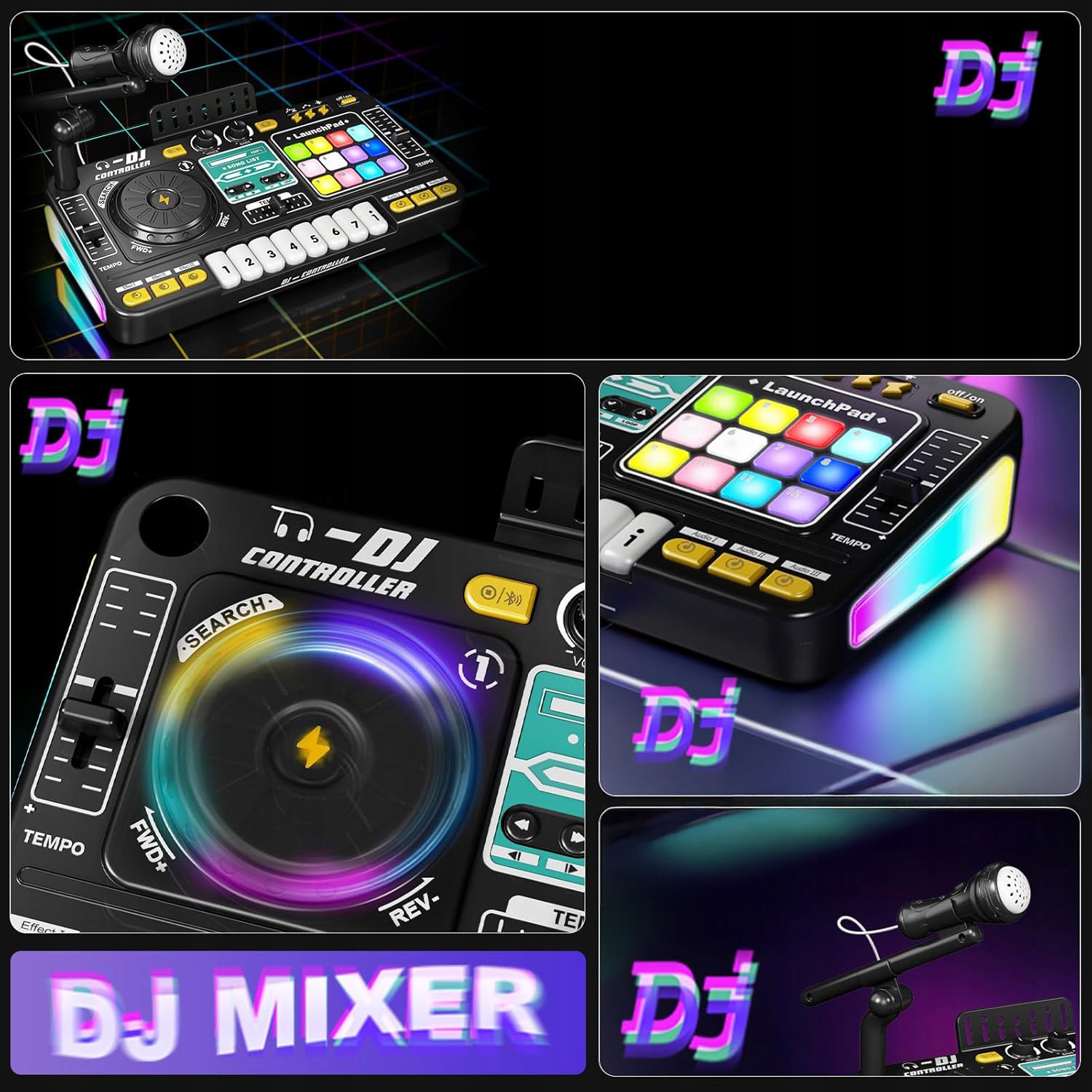 Повний набір мікрофонів із регульованою підставкою: використовуйте мікрофон і регульовану підставку, що входять у комплект, щоб виступати як справжній ді-джей або MC – ідеально підходить для повідомлень, співу чи додавання вокальних ефектів до міксу.