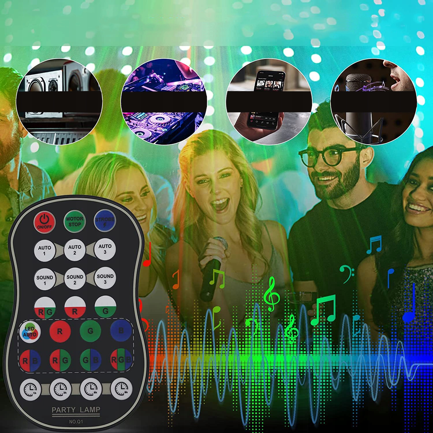 Ви можете легко встановити перемикач на продукті або на пульті дистанційного керування. Світло дискотеки має багато режимів: автоматичний режим (автоматично змінюється світла), миготливий режим (кольори з’являються і зникають швидко, щоб створити миготливий ефект), контроль звуку (колір світла змінюється відповідно до ритмічного звуку навколишньої музики) та режим таймера: 1 година, 3 години, 6 годин або 8 годин.