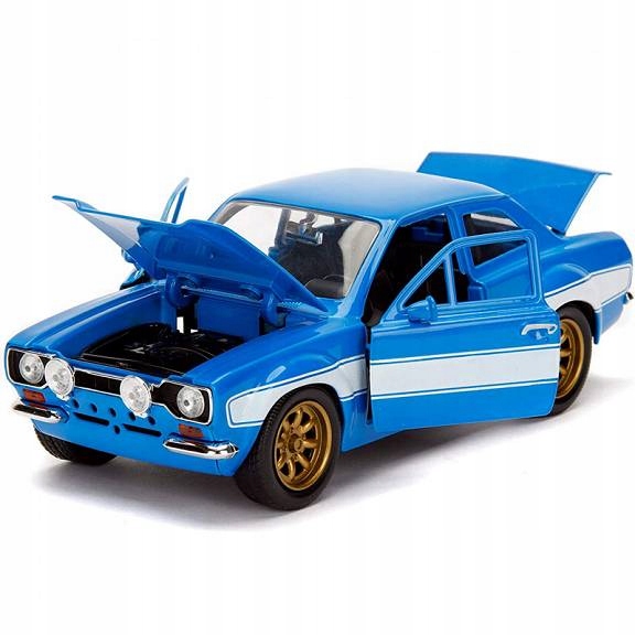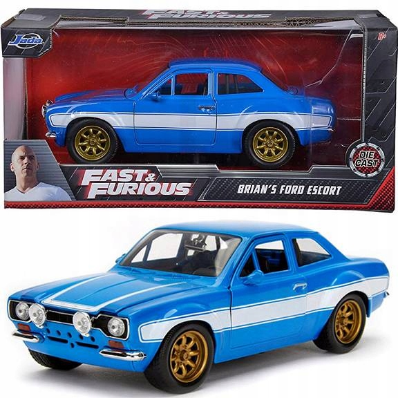 Стійко модифікований FORD ESCORT Брайана 1970 року випуску зі стилістичними елементами прямо з фільму Форсаж. Синій ралійний Ford із виразними білими смугами — це 1,6-літровий Cosworth BDA I4 із забірником холодного повітря K&N, нестандартними ралі-ліхтарями та особливою особливістю — 8-спицеві колеса. Металева модель автомобіля виконана в масштабі 1:24 з дуже точним і детальним відтворенням усіх деталей. Ford Escort, на якому їздить Браян у фільмі, має двері, що відкриваються, двері багажника, що піднімаються, і капот, який дає змогу оглянути моторний відсік і детальний інтер’єр.