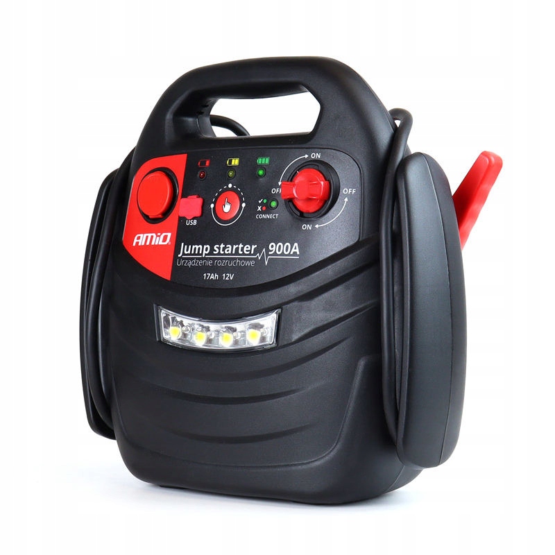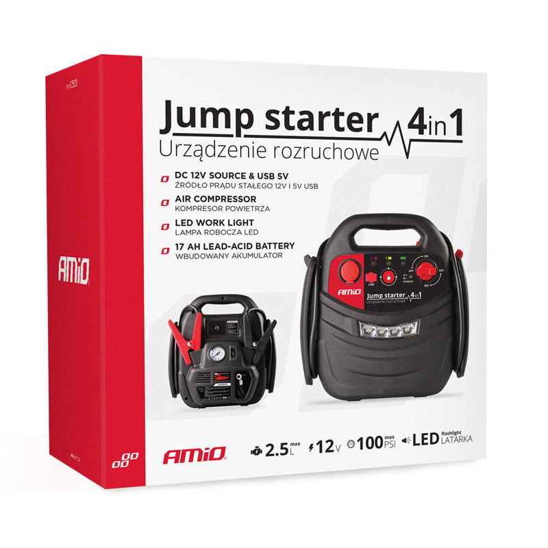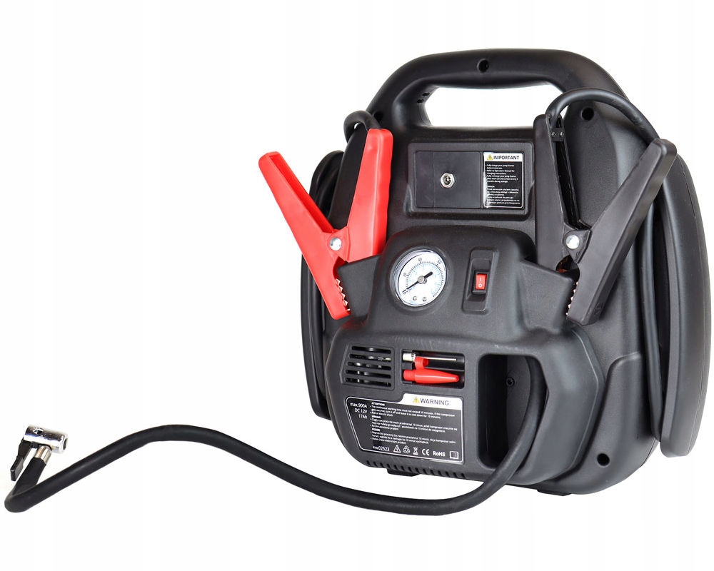 Багатофункціональний пусковий пристрій для запуску автомобіля в разі несправності або розрядженого акумулятора. Портативний пусковий пристрій з акумулятором ємністю 17 Ач і струмом 900 А. Крім того, він має вбудований компресор з манометром, потужний ліхтарик для екстрених робіт у темний час доби та USB-роз’єм для зарядки телефону (Powerbank).