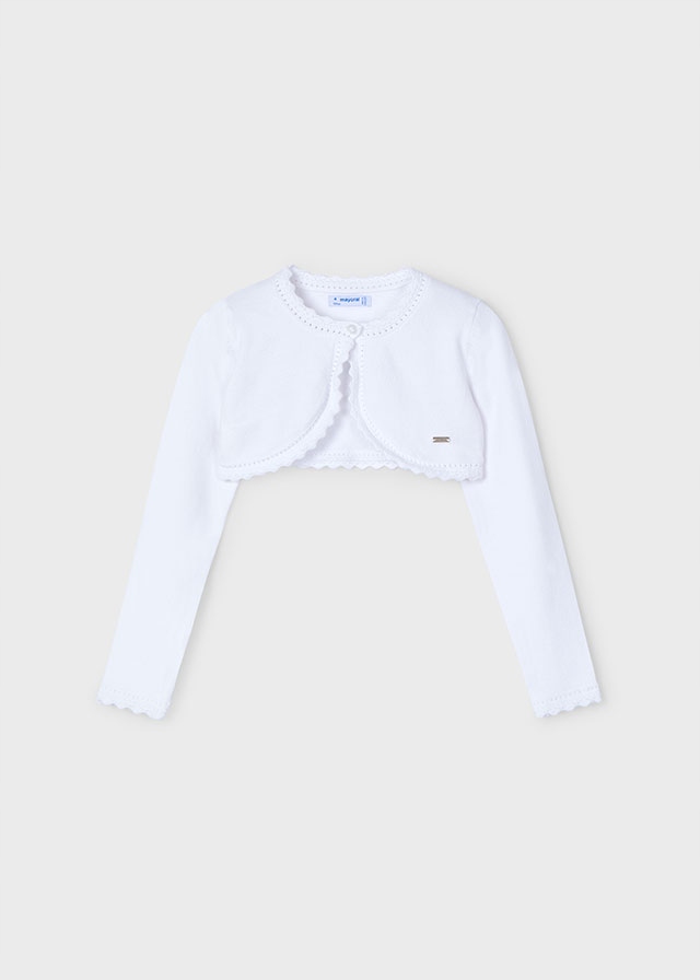 Болеро для дівчинки від іспанської компанії MAYORAL. Застібається на одну кнопку. Довгий рукав. Еластичний і зручний матеріал. Декорації: ажурні елементи.