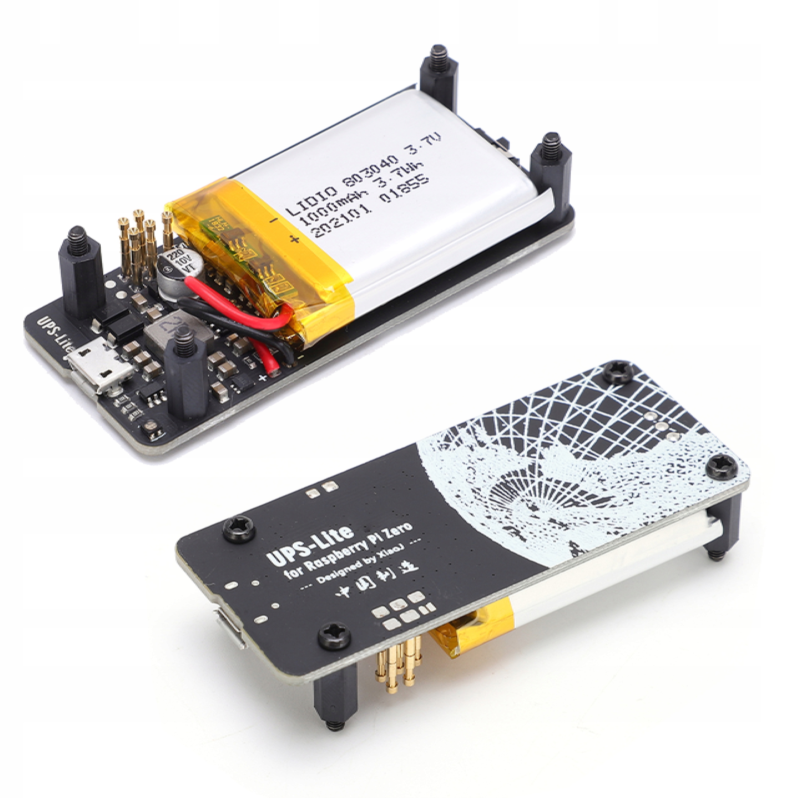- ДБЖ, спеціально розроблений для Raspberry Pi zero, який інтегрує мікросхему індикатора рівня палива (MAX17040G) і літієву батарею на 1000 мАг.