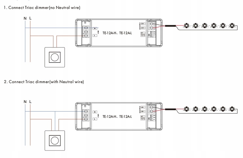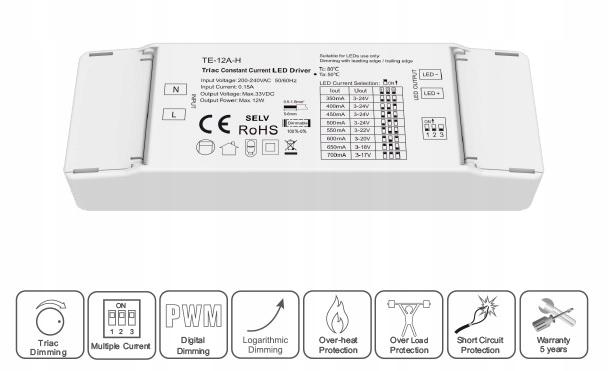 TE-12A-H – висококласне джерело живлення постійного струму потужністю 12 Вт від Skydance, фазове затемнення, призначене для диммерів на симисторах. Цифрове ШІМ затемнення. Відсутність ефекту мерехтіння при затемненні забезпечує користувачеві комфортне освітлення. Джерело живлення має 1-канальний вихід постійного струму, струм налаштовується за допомогою вбудованого DIP-перемикача 350-700 мА. Драйвер захищений від перегріву, перенапруги, перевантаження та короткого замикання за допомогою автоматичного режиму для повернення до нормальної роботи. Розроблено для використання світлодіодів усередині приміщень.