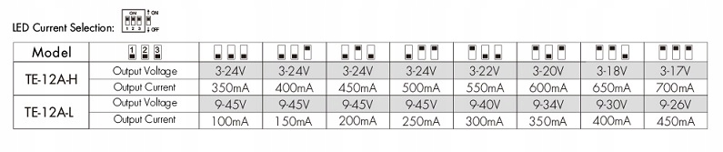 Джерело живлення має 1-канальний вихід постійного струму, а струм налаштовується за допомогою вбудованого DIP-перемикача в діапазоні 350-700 мА. Постійний вихідний струм драйвера підтримується в межах вікна напруги, зазначеного виробником. Спосіб налаштування струму показано на зображенні нижче