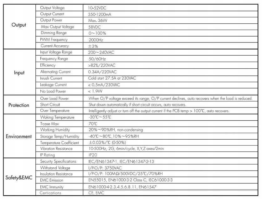 • максимальна вихідна потужність 36 Вт• постійний вихідний струм, встановлений за допомогою DIP-перемикача від 350 мА до 1200 мА• напруга живлення 200-240 В змінного струму• діапазон вихідної напруги 10- 52 В постійного струму• фазове диммування / Push dimmin• призначено для симисторних диммерів• пластиковий корпус із повною ізоляцією• відсутність ефекту мерехтіння під час затемнення• ШІМ-цифрове затемнення• призначення: внутрішні світлодіодні світильники• захист від перегріву, короткого замикання, перенапруги та перевантаження• гарантія 5 років• висока якість виконання