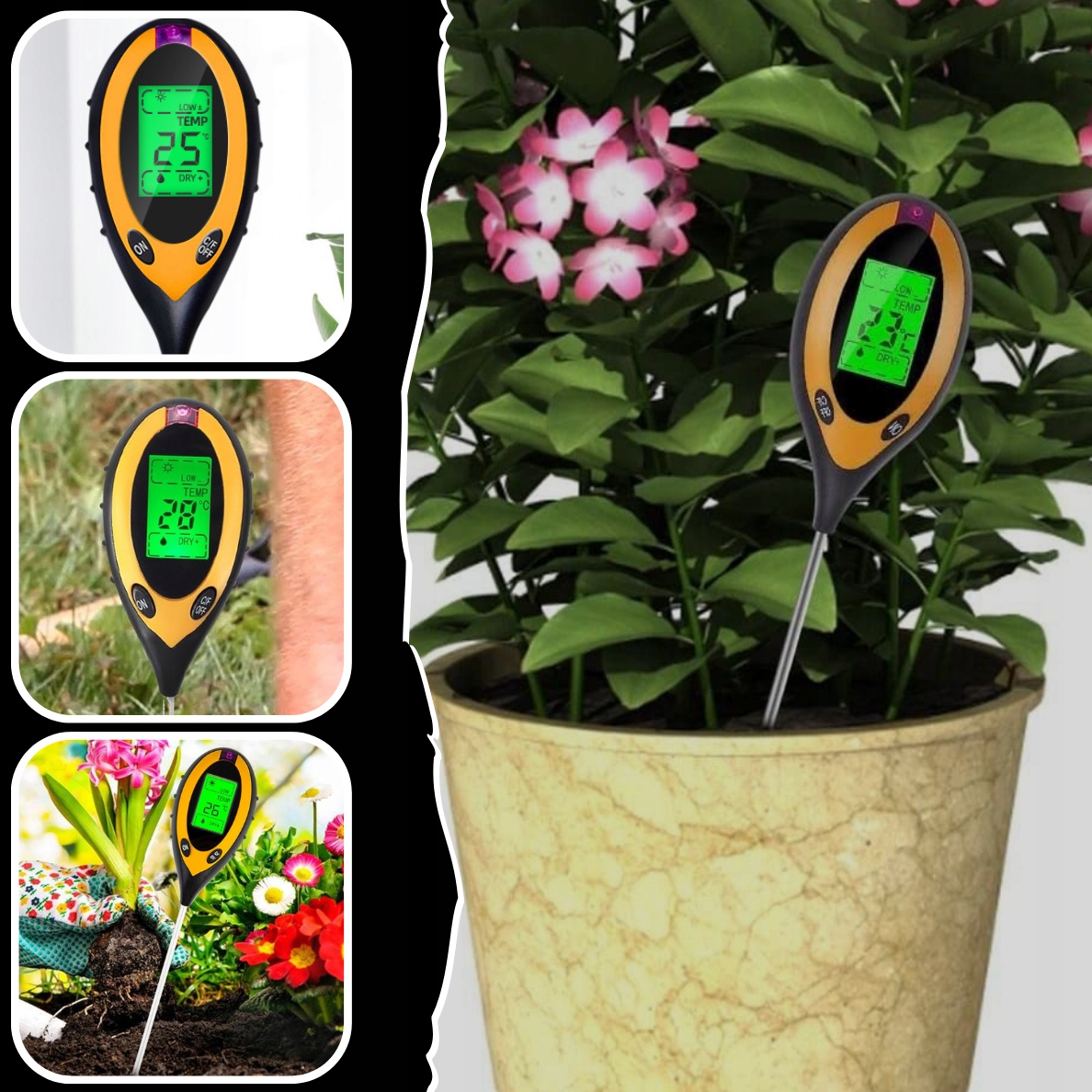 Чому варто купувати наш продукт? Завдяки точним результатам вимірювання ви можете ефективно піклуватися про свої рослини та забезпечити їх оптимальні умови росту. Незалежно від того, у вас є невеликі горщики вдома чи величезний сад, цей пристрій буде працювати ідеально і допоможе вам стежити за станом ґрунту. Завдяки двом кнопок ви можете легко перемикатися між різними функціями та прочитати результати вимірювання. Сервіс інтуїтивно зрозумілий, навіть для користувачів -початківців. Завдяки точним вимірюванням ви можете адаптувати умови вирощування до вимог різних видів рослин та забезпечити їм оптимальне середовище росту. Суцільна конструкція та корозійна стійкість з довжиною 20 см гарантують надійність та точність вимірювань тривалий час.
