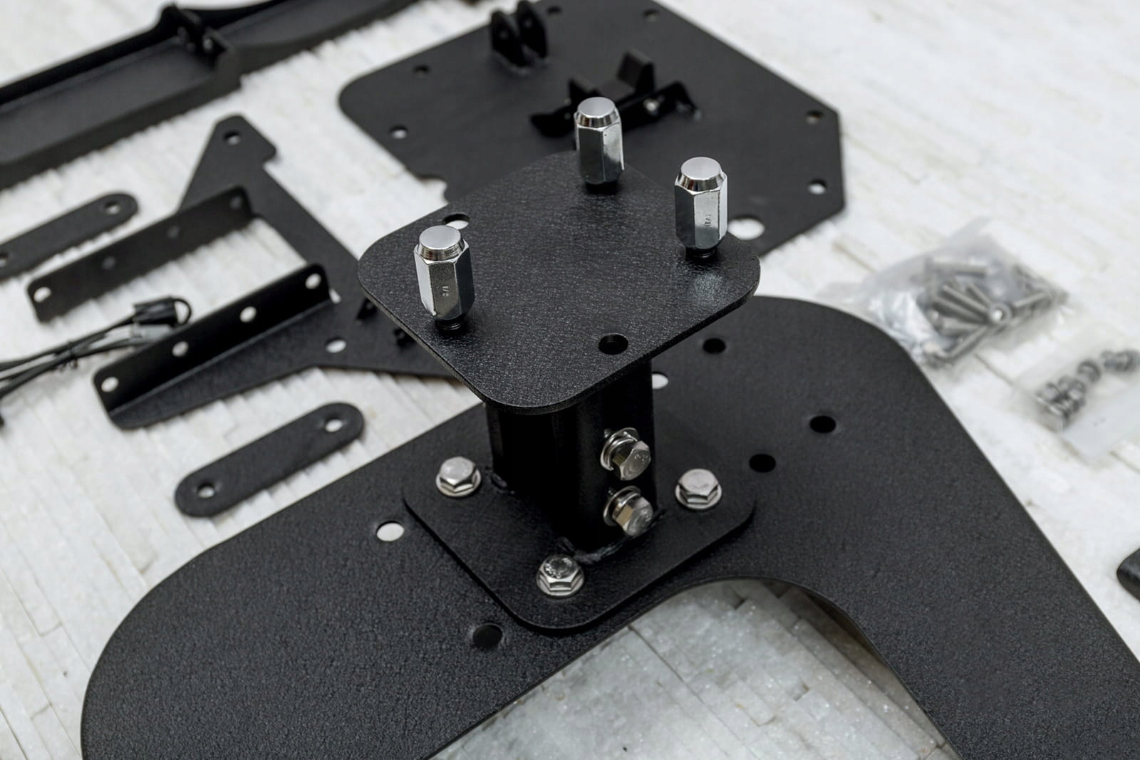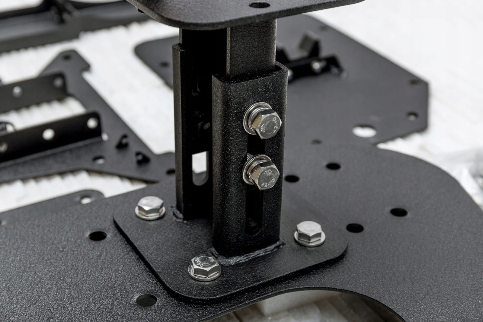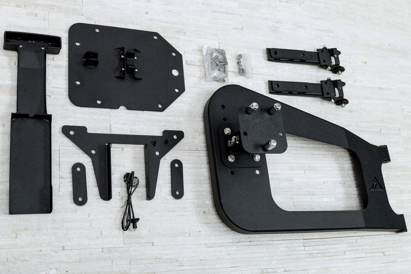 Цей елемент виконує важливу функцію, оскільки дозволяє встановити велике запасне колесо, не боячись пошкодити двері багажника під впливом великої ваги, яка завдяки своїм кронштейнам рівномірно розподіляє вагу колеса. Додатково весь важіль посилений, що дозволяє впевнено їздити навіть по бездоріжжю. Виріб оснащено кріпленням стоп-сигналу над колесом, завдяки якому ми знову можемо насолоджуватися третім стоп-сигналом, тим самим підвищуючи нашу безпеку. У той же час ліхтар буде виглядати чудово, унікально підкреслюючи позашляховий характер вашого Wrangler