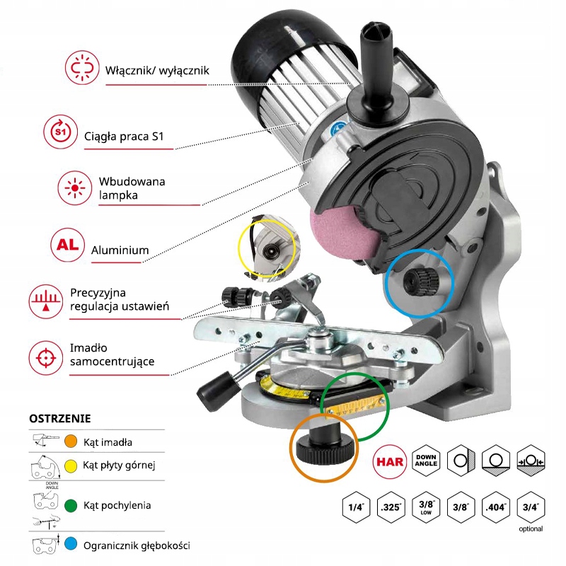 Електрична точилька Jollyevo - це професійний інструмент, призначений для заточення ланцюгів із шкалою від 1/4 "до .404". Це ідеально працює з інтенсивним використанням у майстернях, лісових та будівельних компаніях.