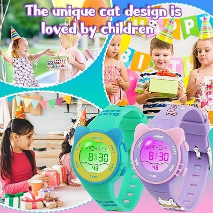 Джубуос Дитячий годинник -це ідеальне поєднання веселощів та практичності-чарівного дизайну в стилі кішки, 7-кольорова світлодіодна підсвічування та функції, такі як будильник та секундомір роблять дітей охоче носити його щодня.