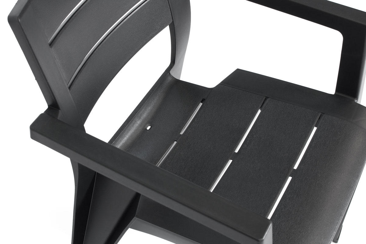 Стільці з терасного комплекту мають привабливу текстуру, що імітує дошку на спинці та сидінні. Завдяки цьому вони виглядають естетично і сучасно. Вони ідеально поєднуються з іншими меблями з пластику та подібних матеріалів.