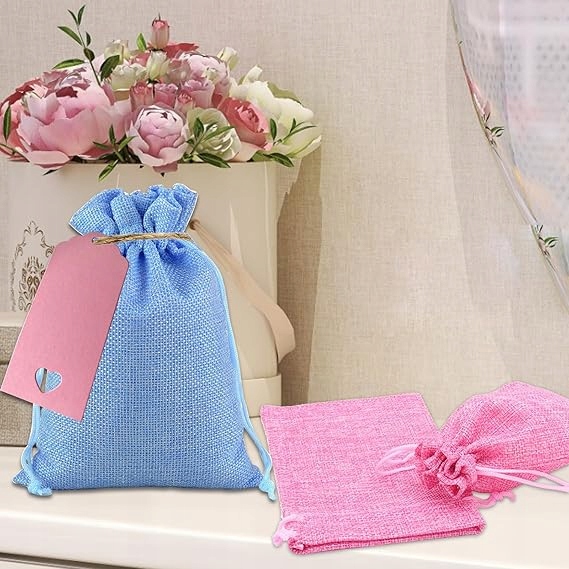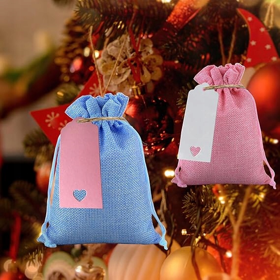 - Вміст упаковки отримає набір сумки для джуту, 30 мішків для джуту для подарунків, 30 чистої картки та 10-метрова струна. Подарункові пакети доступні у двох кольорах, синій та рожевий, 15 штук у кожному кольорі, кожна з розмірами 10 х 14 см.