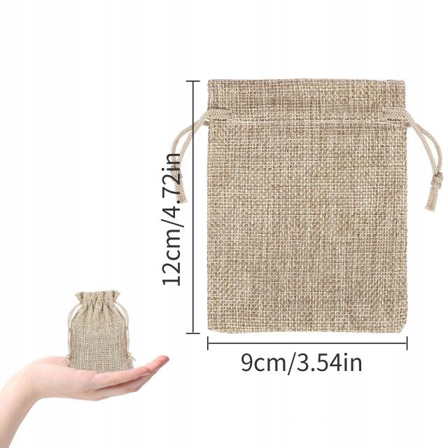 Чистий натуральний матеріал: подарункові пакети з натурального льону, нетоксичні та екологічно чисті, безпечні та гігієнічні. Джутовий мішок повітряний і дуже легкий. Міцний матеріал, який не легко зламати, може використовуватися протягом тривалого часу. 9x12 см