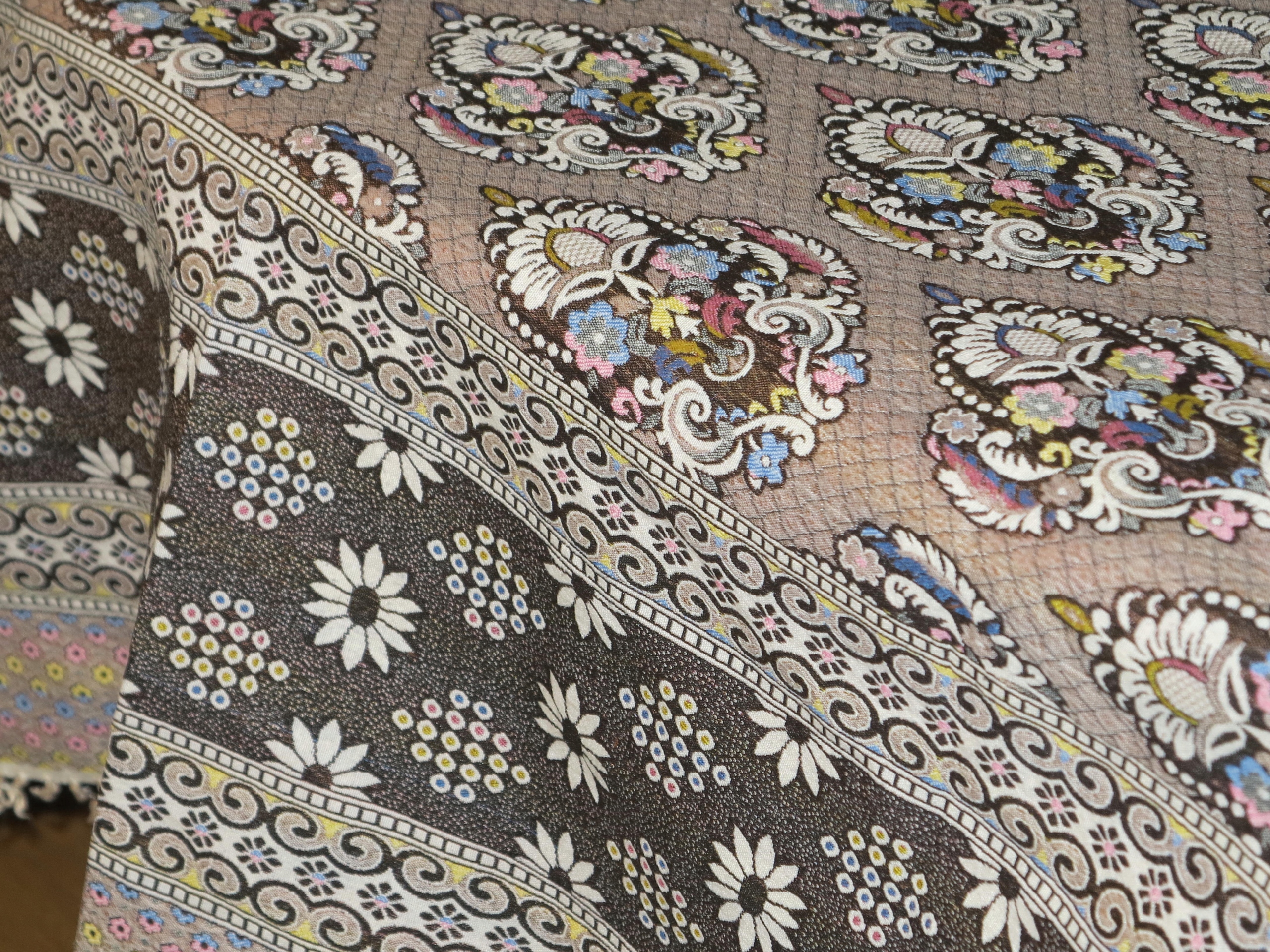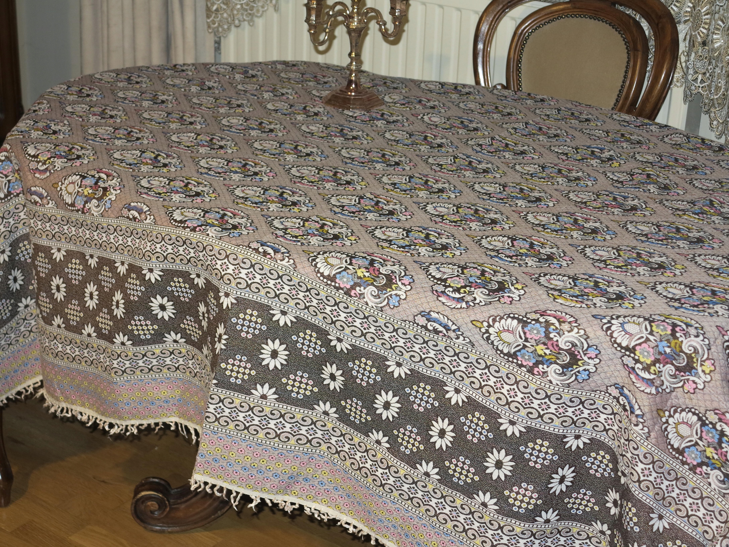 Предмет аукціону надзвичайно красивий, дуже великий , гобеленову скатертину або накидку, стильних кольорів та візерунків. Скатертина має розміри: 254/208 см плюс бахрома. Скатертина б/у, в дуже хорошому стані та якості, незважаючи на вік. Рекомендую, ідеальна прикраса для стильного інтер'єру.