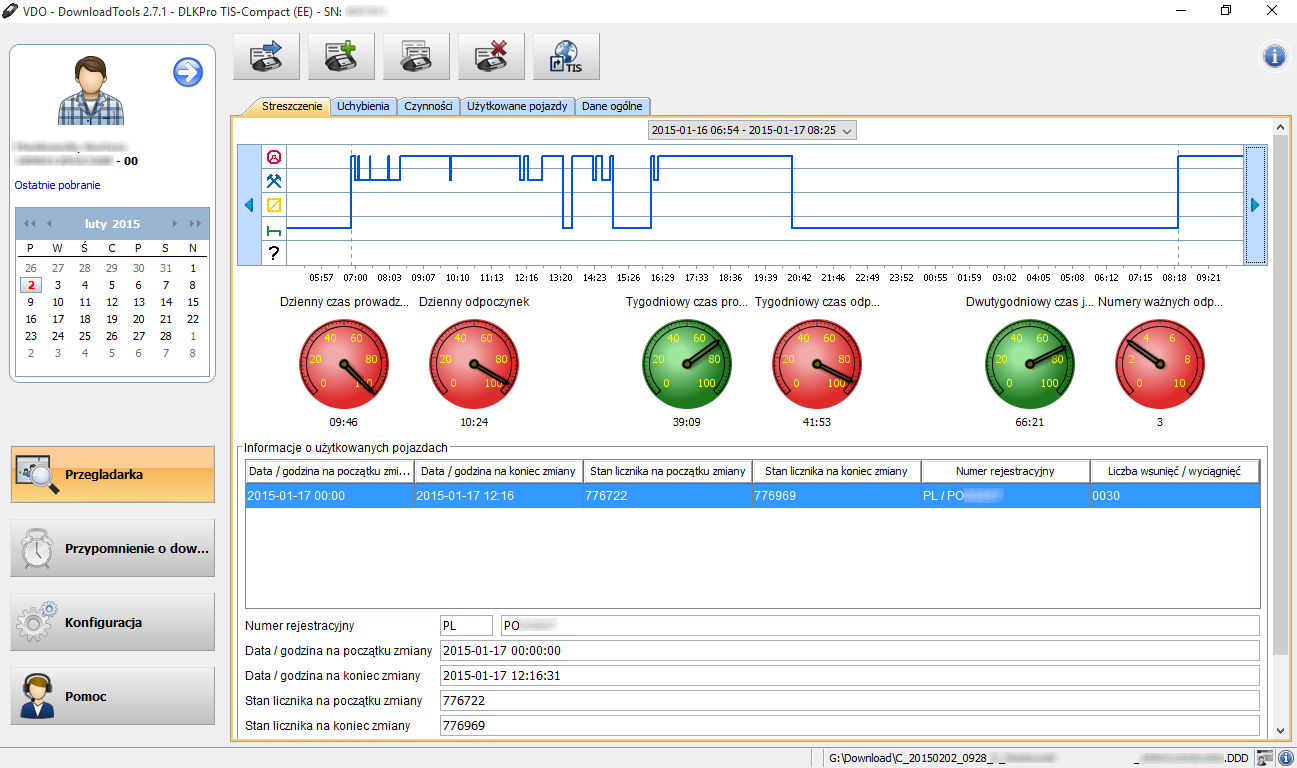 У меню також відображається вибрана інформація з масової пам’яті тахографа та картки водія, збереженої в DLK Pro: