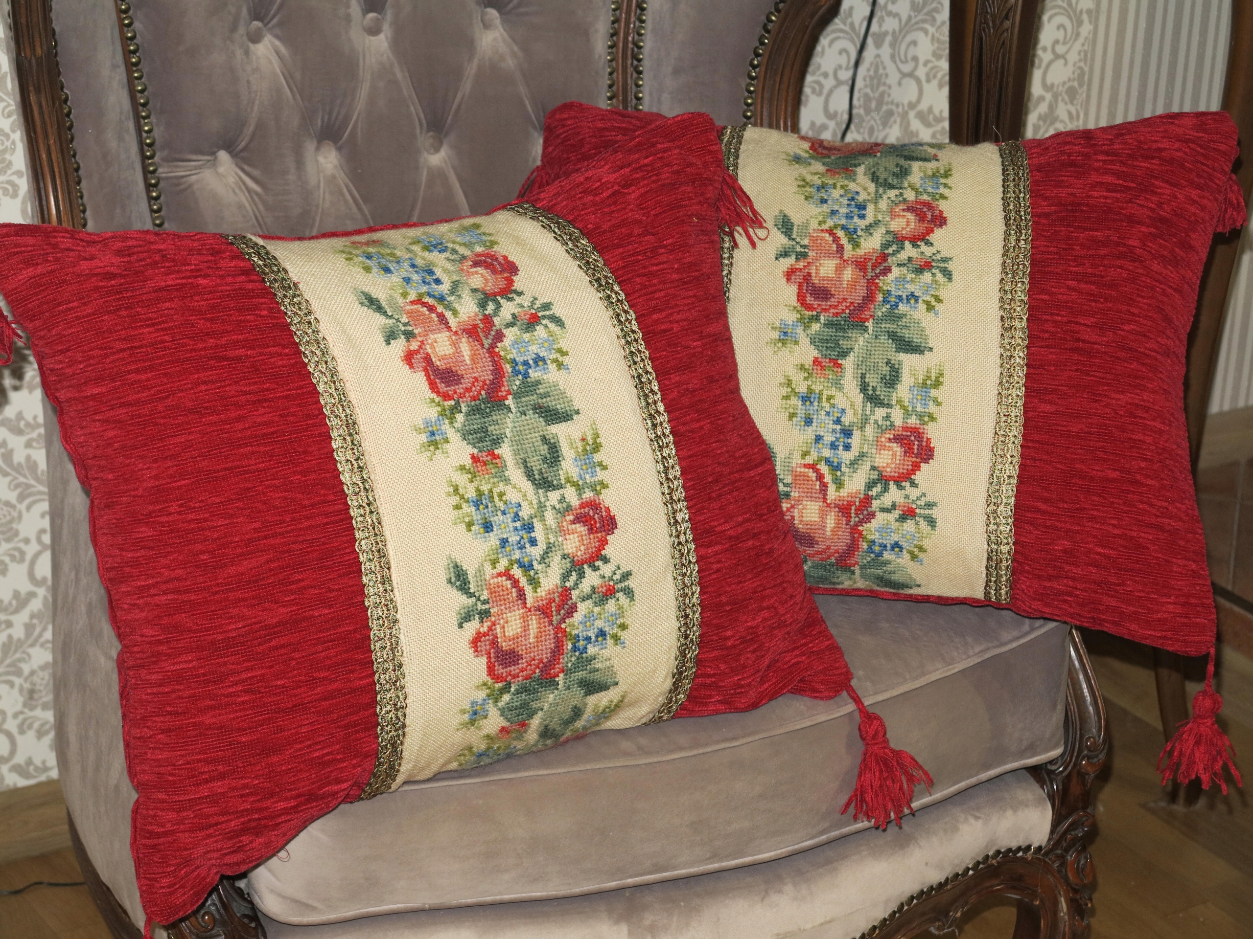 Предмет аукціон - набір дуже декоративних, стильних подушок, з ручною вишивкою хрестиком, дуже хитромудрого виконання. Набір б/у, в дуже хорошому стані та якості. Рекомендую