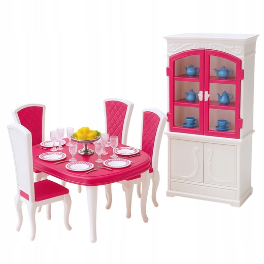 - Обідній набір для ляльок — це елегантний набір меблів і аксесуарів, ідеальний для гри з ляльками висотою приблизно 29 см. Він складається з великого столу, стільців, серванта та багатого набору посуду та декорацій. Завдяки цьому діти можуть створювати реалістичні сцени, пов'язані з приготуванням їжі та організацією вечері. У серванті з дверцятами, що відкриваються, можна розмістити тарілки, чашки, глечики та інший посуд. Гра розвиває у дітей творчі здібності, соціальні навички та уяву. Набір ідеально доповнює ляльковий будиночок, а також може використовуватися як окремий комплект меблів. Міцна конструкція з міцного пластику забезпечує стійкість і привабливий зовнішній вигляд. Продукт відповідає стандартам безпеки CE та EN71, що забезпечує безпечне використання. Це ідеальний спосіб розвинути здібності дітей і подарувати їм творче задоволення.