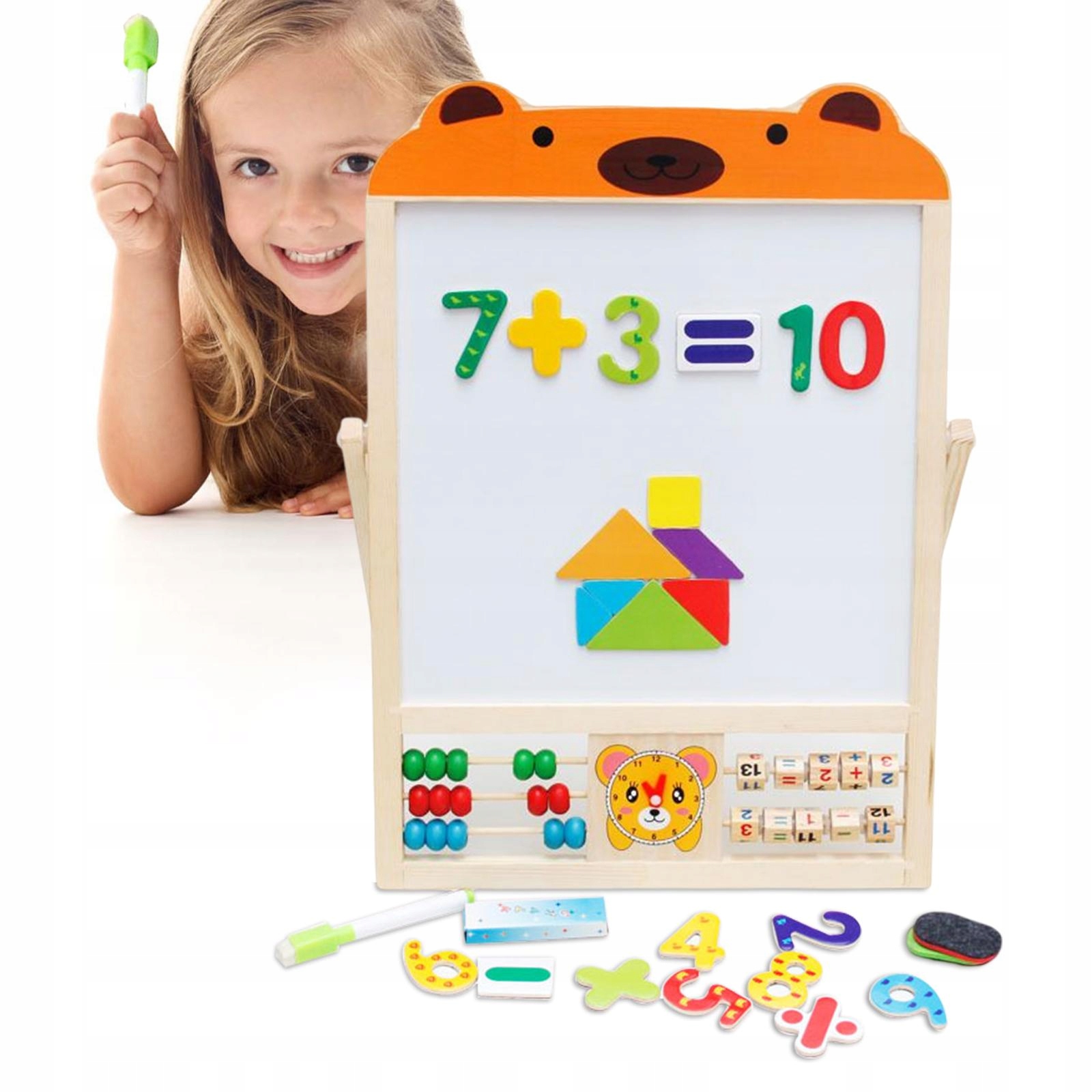 ДВОСТОРОННЯ ДОШКА ДЛЯ МАЛЮВАННЯ: одна сторона — це дошка, на якій можна писати крейдою (гумкою на дошці можна стирати), а інша — магнітна дошка, які можна написати акварельною ручкою (акварельну ручку можна стирати), або магнітні наклейки з цифрами та танграми можна прикріпити до дошки для малювання, щоб отримати знання з математики, і діти також можуть використовувати арифметичні намистини під дошкою для малювання, щоб допомогти в операціях.