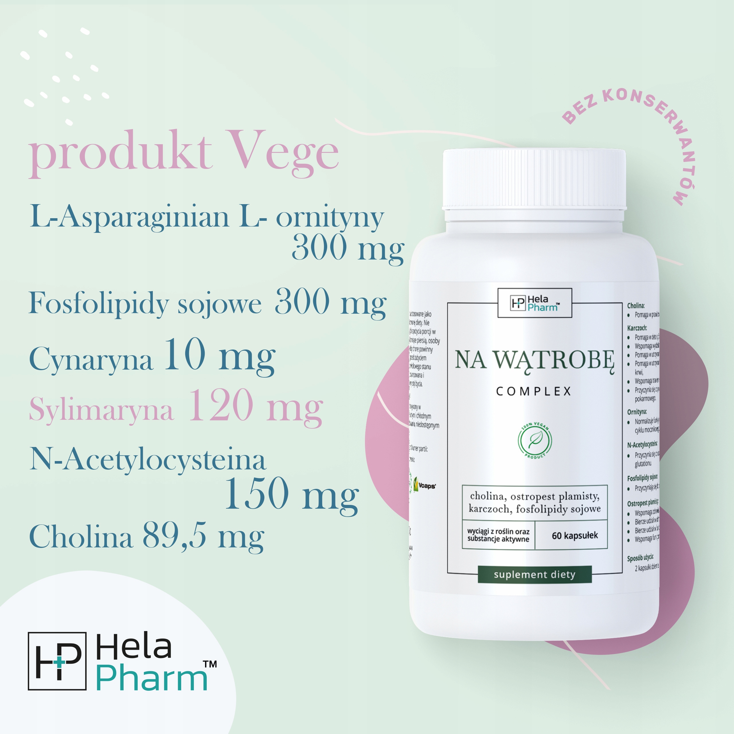 СКЛАД:L-орнітин L-аспартат, соєві фосфоліпіди, рослинна капсула Vcaps® (гідроксипропілметилцелюлоза - компонент оболонки), екстракт листя артишоку (Cynara scolymus), молоко екстракт насіння розторопші (Silybum marianum), N-ацетилцистеїн, холін хлорид.