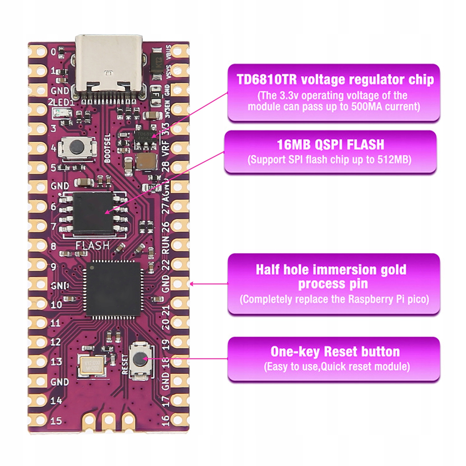 3. Підтримка кількох програм: Pico має багату та повну підтримку програмного забезпечення, повністю сумісну з офіційним RasPi C/C++ SDK, Micro python SDK. 16 МБ вбудованої флеш-пам'яті QSPI для зберігання коду та даних. Максимальний робочий струм до 500 мА.